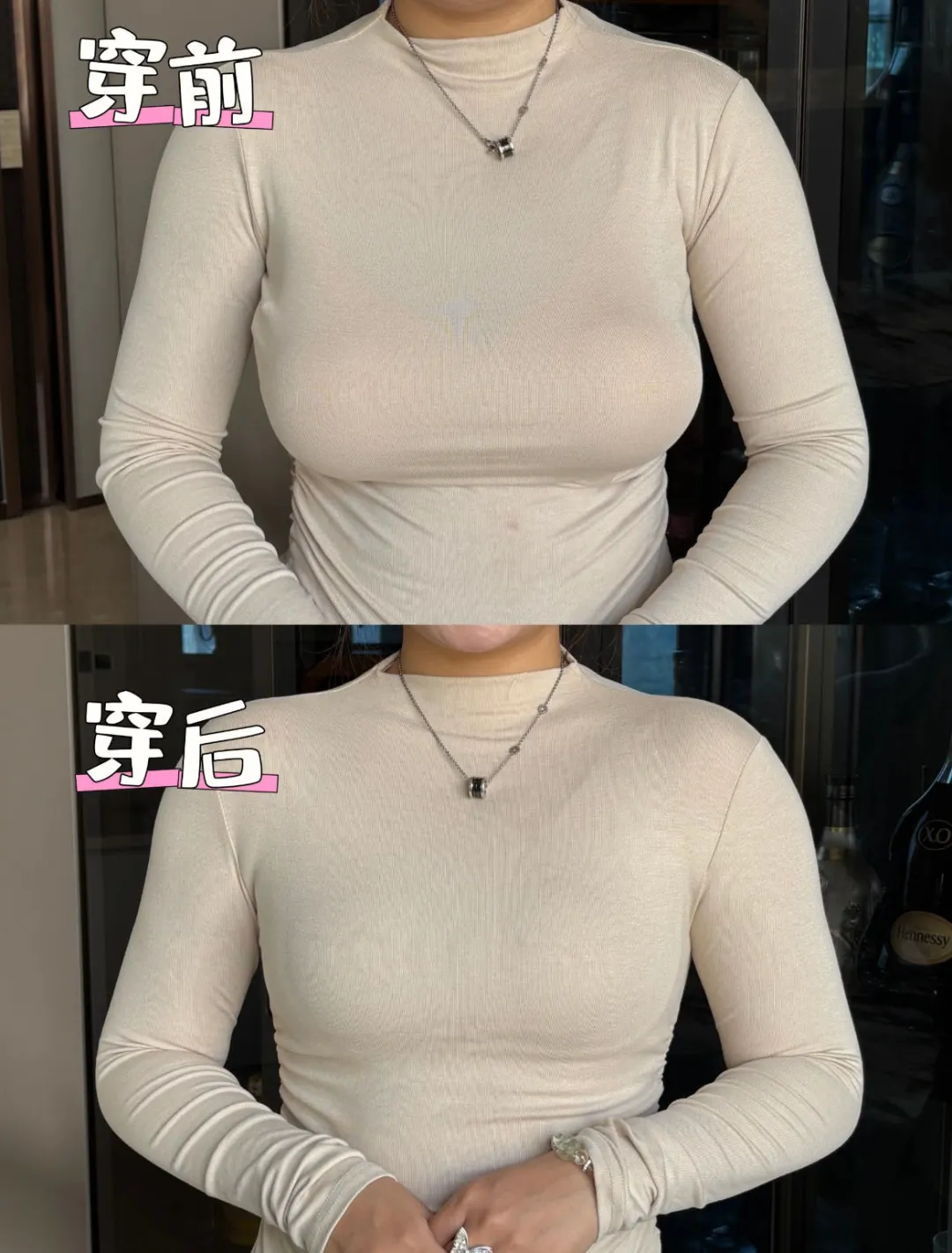 不开玩笑,拿到手就找了同事迫不及待换上了,来看看和大厂粉底液内衣的对比: