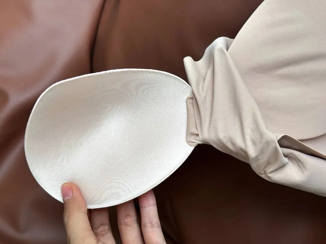 内置水滴形胸垫,基础厚度为0.5cm,下缘加厚至1.2cm,从根部承托上托,防止胸型外扩下垂。