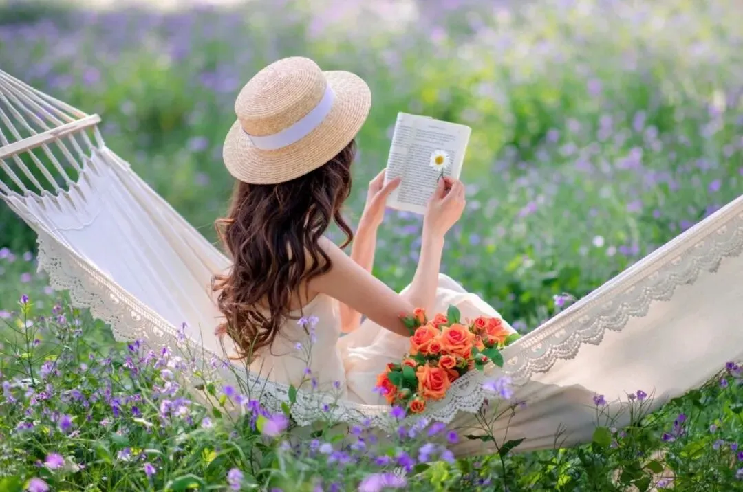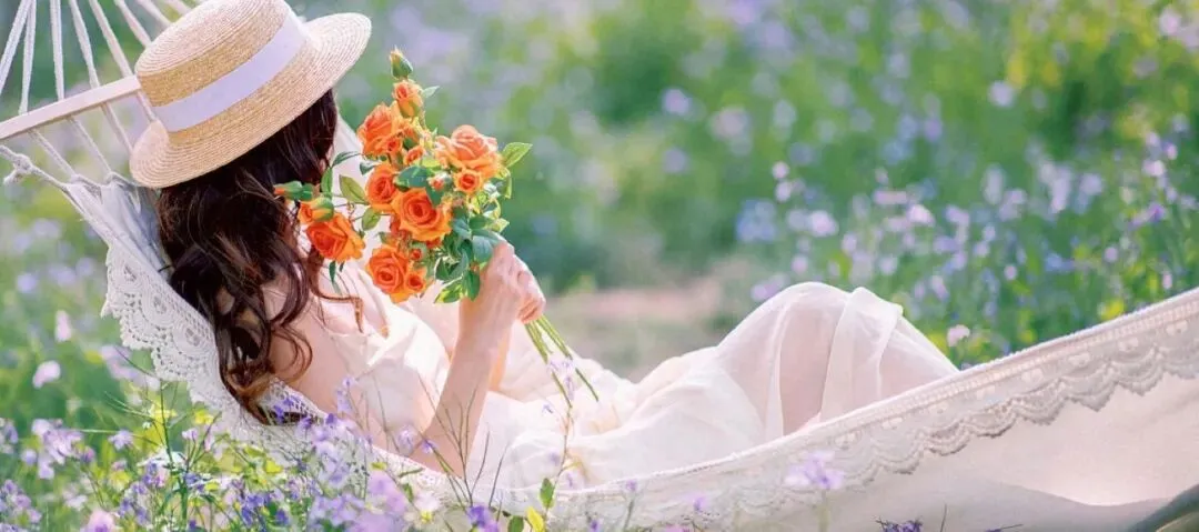 一、吊床躺卧,花束遮面慵懒感 🛋️