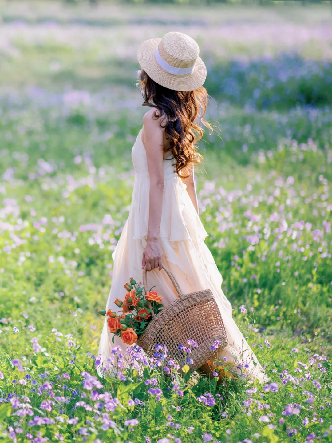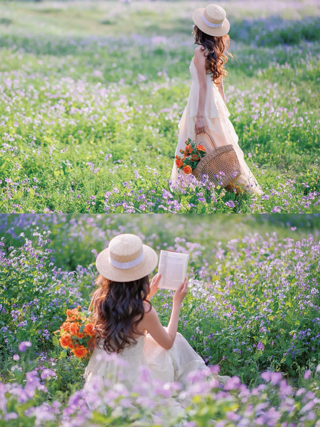 【穿搭建议】 大摆长裙是关键!坐下时裙摆铺开,与花海融为一体,画面层次感直接up up!📈