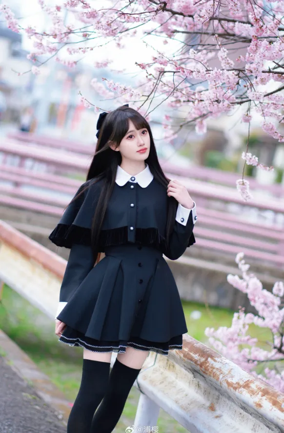 :黑白学院风 + 斗篷设计,千金感拉满,和樱花适配度 100%,拍照巨出片;