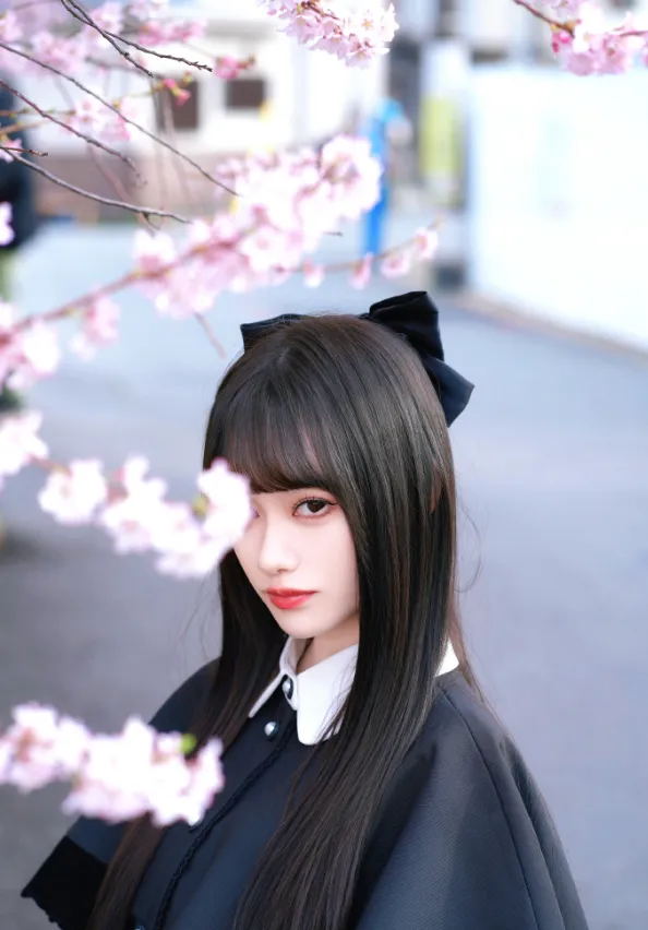 :搭配黑长直发型,甜妹感直接拉满,修饰脸型,显脸小效果翻倍,在樱花树下拍照巨出片;