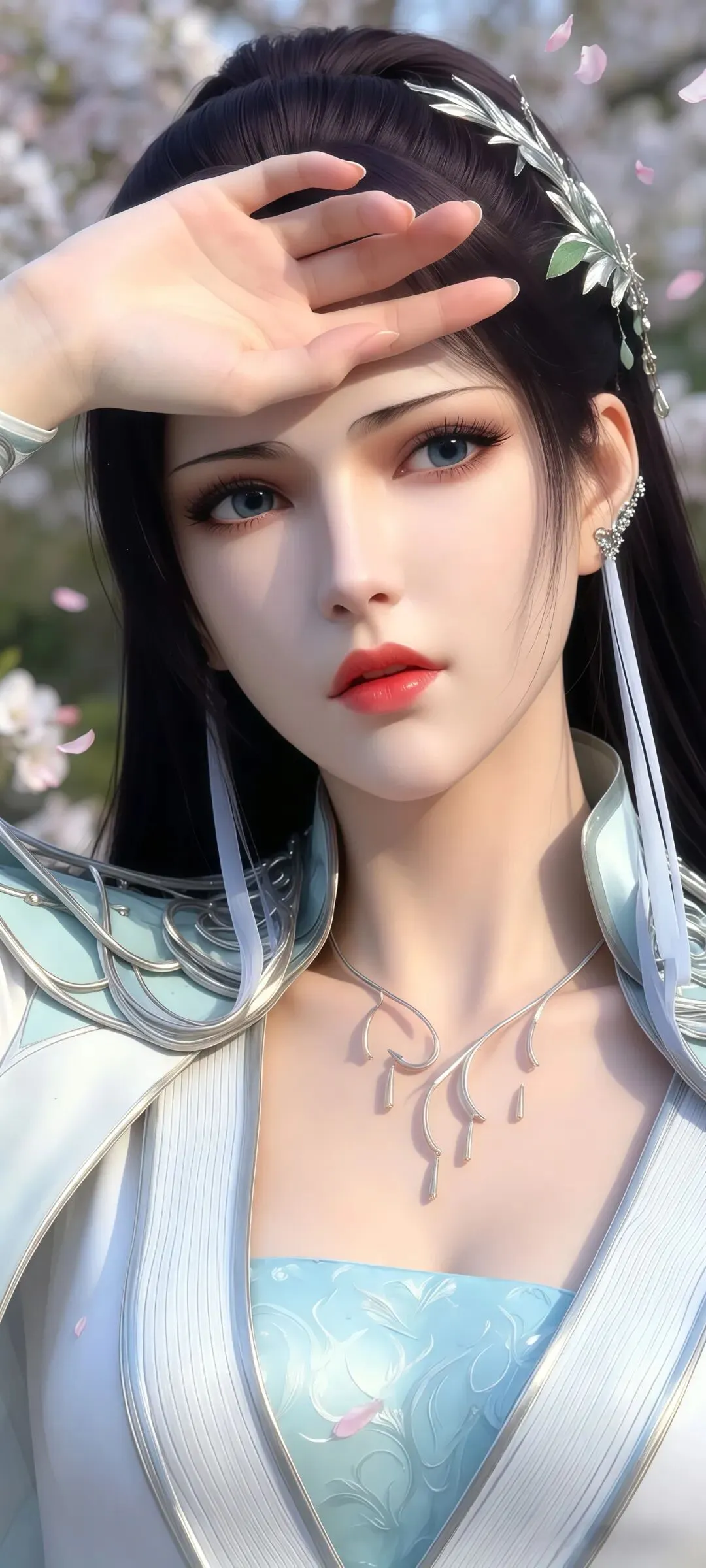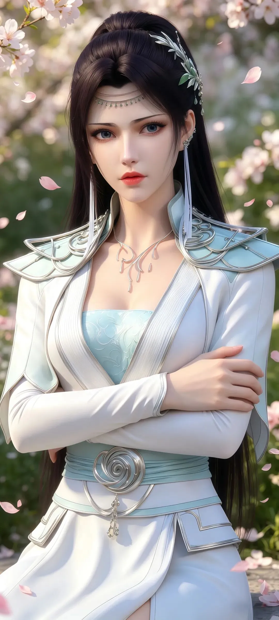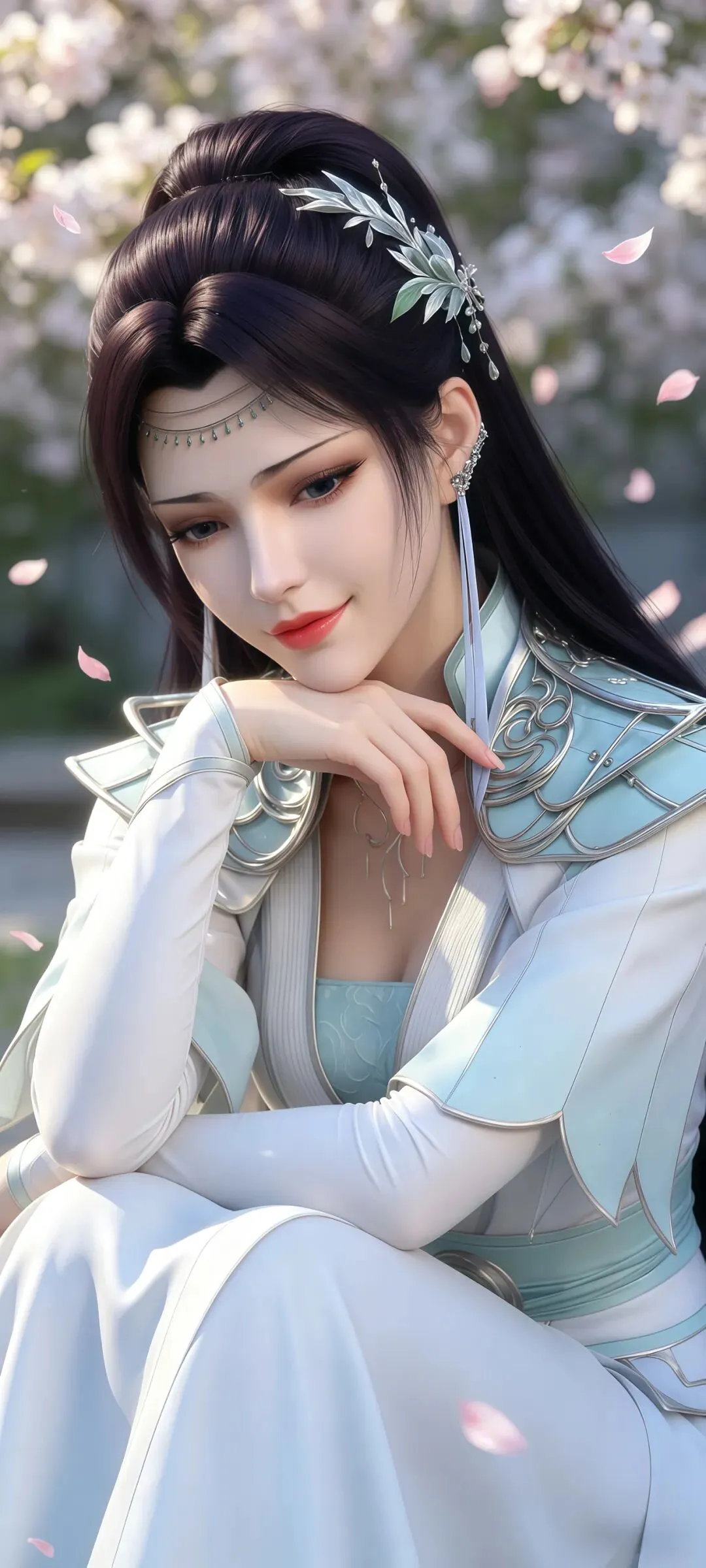 如果说眉眼神韵是这组壁纸的国风之魂,那超清画质下毫厘毕现的服饰配饰细节,就是它撑起极致国风美感的核心底气,将《斗破苍穹》顶级的国风CG制作水准展现得淋漓尽致。创作者对画面细节的把控严苛到了极致,云韵的经典浅青色广袖仙裙,完全参考汉服交领大袖衫的传统形制,衣身的面料质感在超清画面里精准还原:外层的冰绡纱面料有着如传统杭罗般的通透感,柔光穿过广袖时的光影渐变自然灵动,内层的云锦面料呈现出宋锦般的温润光泽,随着身体摆动形成的褶皱自然流畅,彻底摆脱了国漫壁纸常见的塑料感。衣身暗绣的祥云纹与剑形图腾,复刻了苏绣的细腻针法,每一针的走线都清晰可见,发间的流云玉簪、腰间的玉佩流苏、手中长剑的青铜剑鞘纹饰,甚至是裙摆流苏的根根丝线,都在超清画质里分毫毕现,搭配周身流转的风系斗气化翼特效,让静态的壁纸生出了衣袂飞扬的国风仙气。