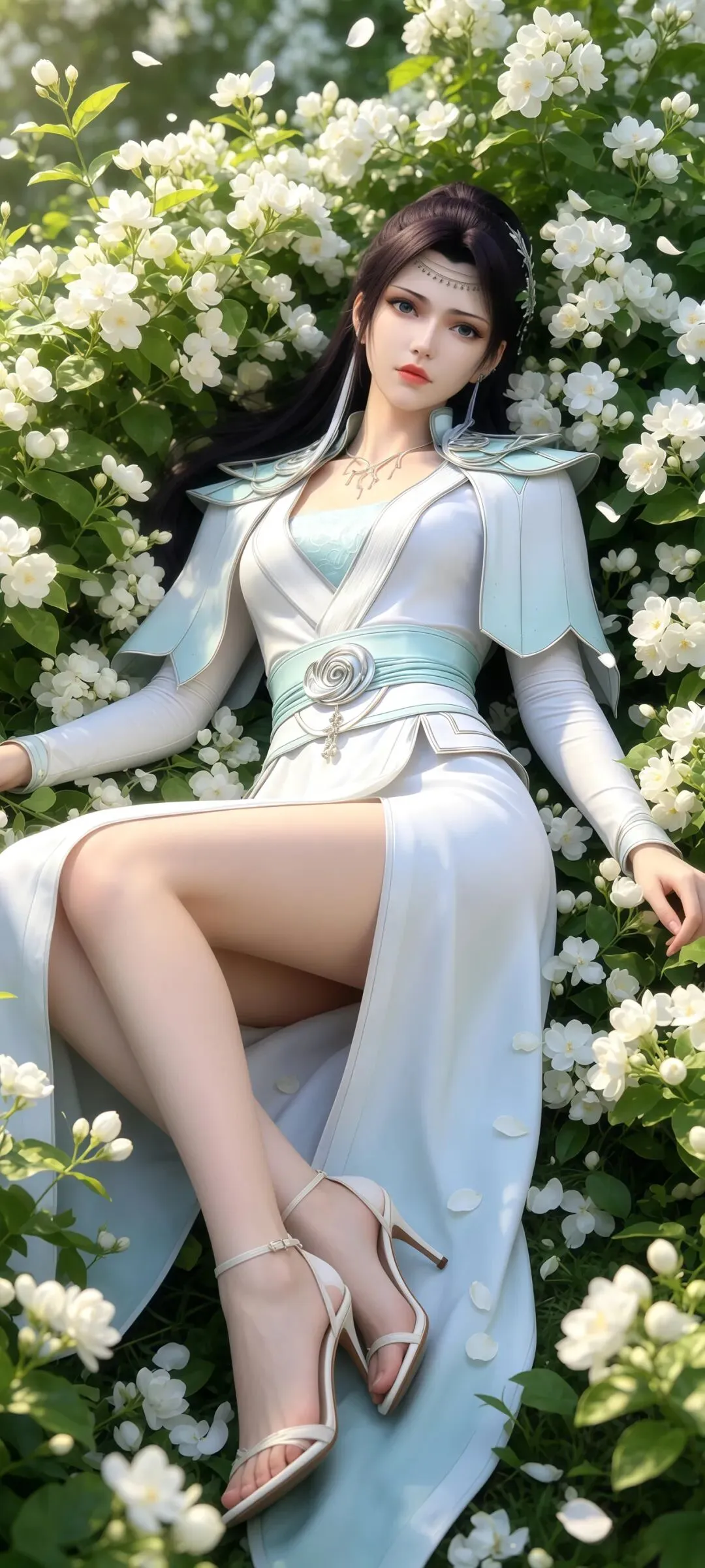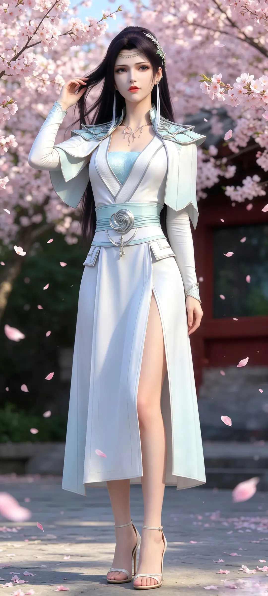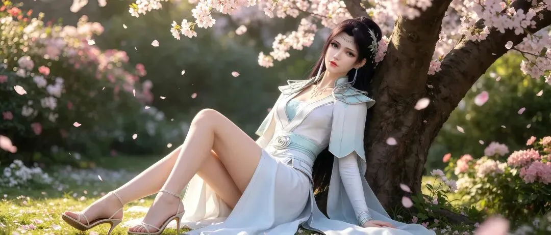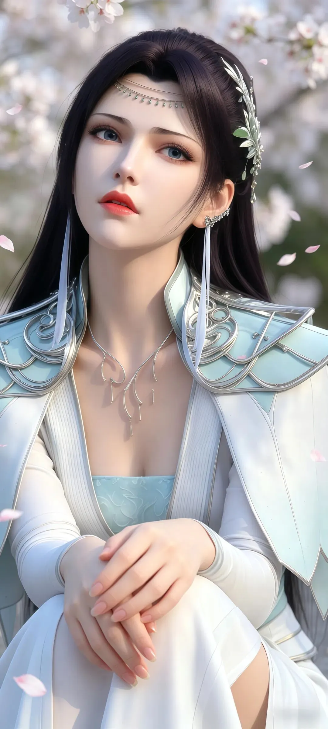 如果说眉眼神韵是这组壁纸的国风之魂,那超清画质下毫厘毕现的服饰配饰细节,就是它撑起极致国风美感的核心底气,将《斗破苍穹》顶级的国风CG制作水准展现得淋漓尽致。创作者对画面细节的把控严苛到了极致,云韵的经典浅青色广袖仙裙,完全参考汉服交领大袖衫的传统形制,衣身的面料质感在超清画面里精准还原:外层的冰绡纱面料有着如传统杭罗般的通透感,柔光穿过广袖时的光影渐变自然灵动,内层的云锦面料呈现出宋锦般的温润光泽,随着身体摆动形成的褶皱自然流畅,彻底摆脱了国漫壁纸常见的塑料感。衣身暗绣的祥云纹与剑形图腾,复刻了苏绣的细腻针法,每一针的走线都清晰可见,发间的流云玉簪、腰间的玉佩流苏、手中长剑的青铜剑鞘纹饰,甚至是裙摆流苏的根根丝线,都在超清画质里分毫毕现,搭配周身流转的风系斗气化翼特效,让静态的壁纸生出了衣袂飞扬的国风仙气。