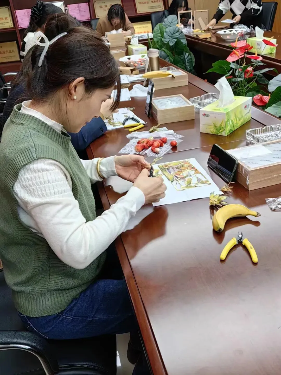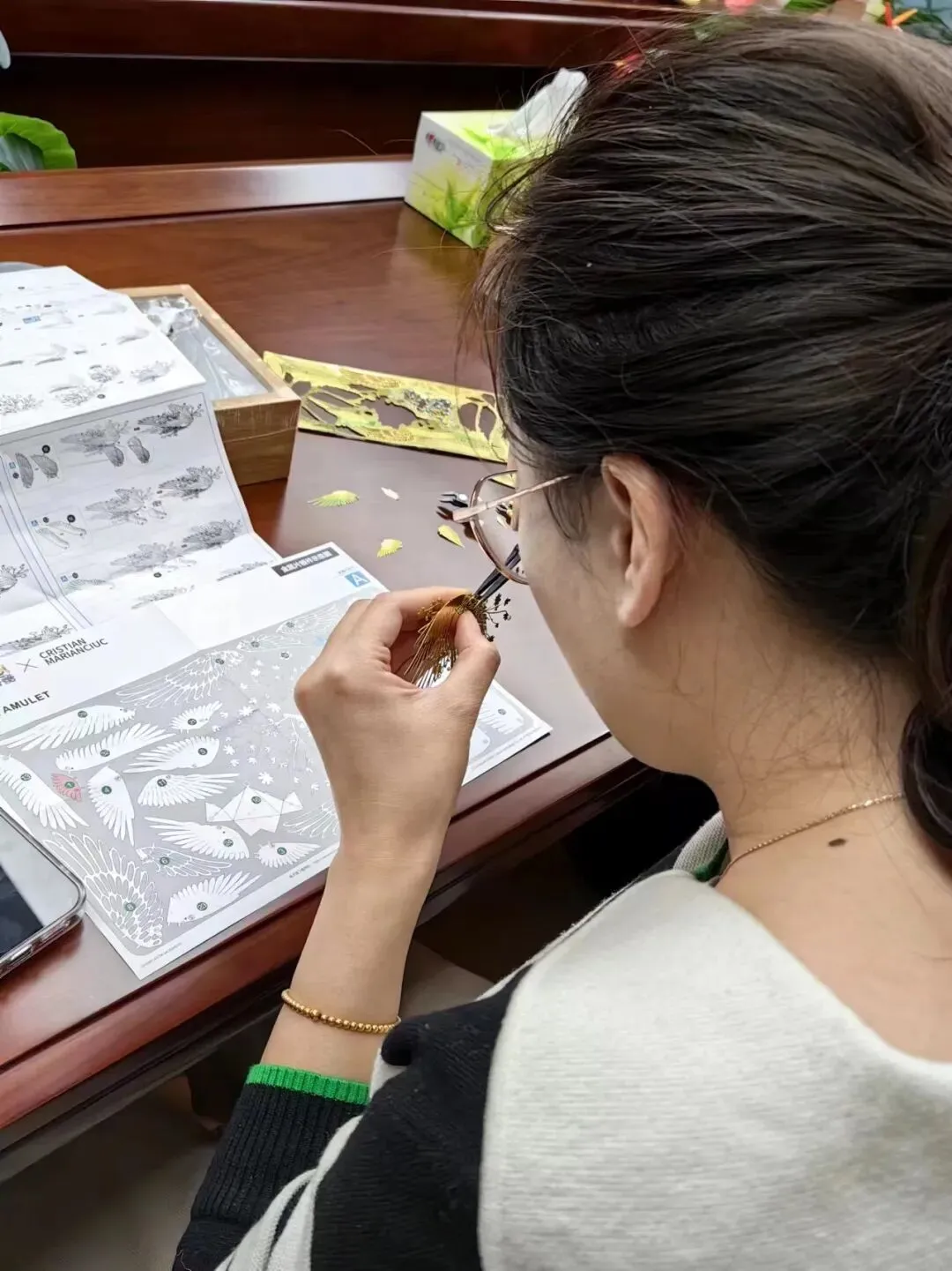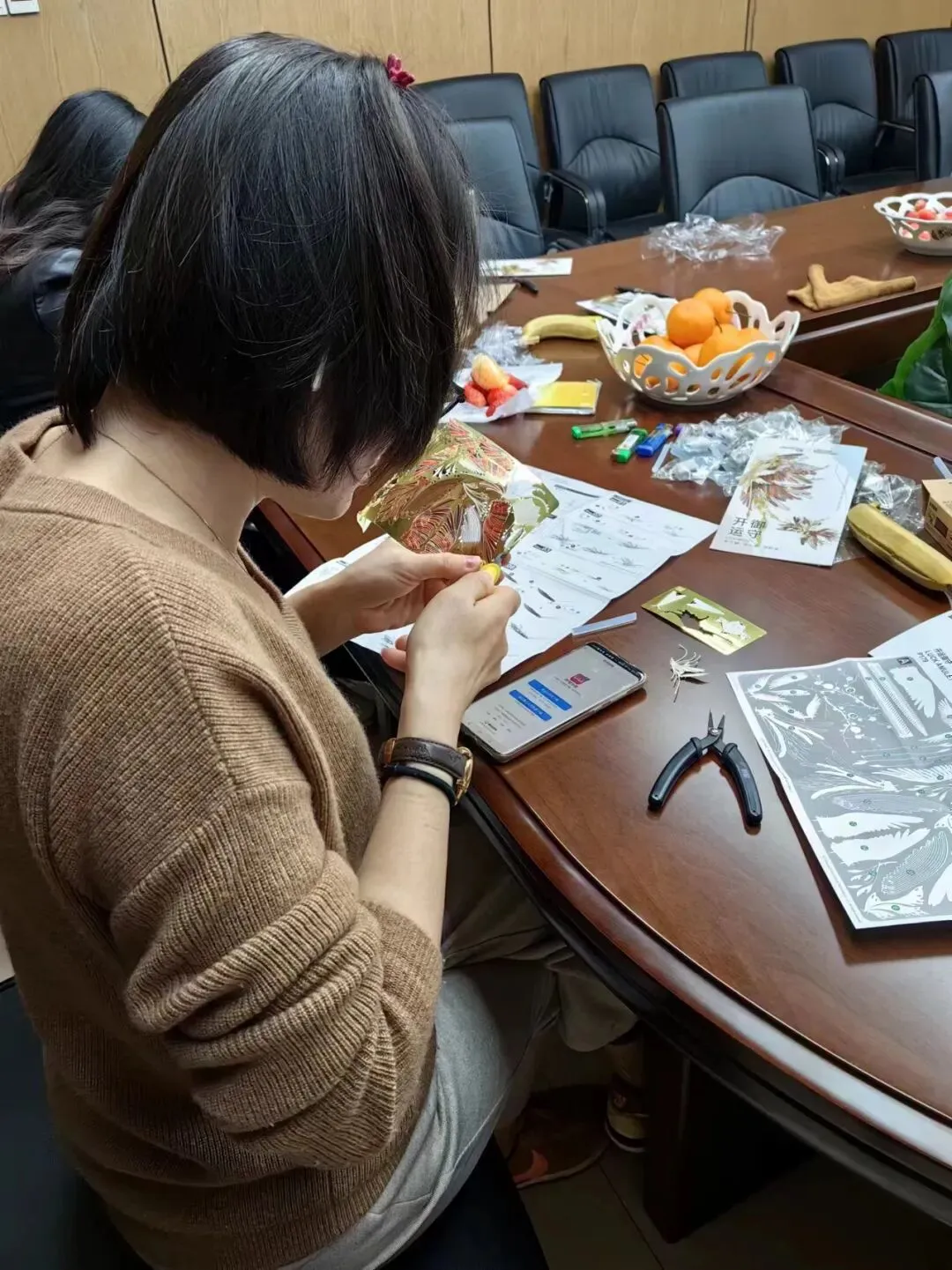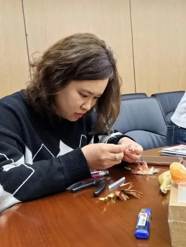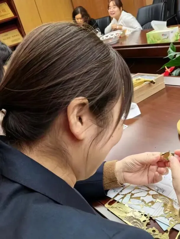 随后,大家一起观看了金属拼插千愿鹤的制作视频,女职工们聚精会神、全神贯注地投入到制作中去。一双双巧手,灵巧的取下插板上的部件,再粘贴到底座上,一个个栩栩如生的仙鹤、初具雏形。鹤在中国文化中有崇高的地位,是长寿、吉祥和高雅的象征。它也是鸟类中最高贵的一种鸟,象征高洁品格,千愿鹤也寄托着大家对美好生活的向往。现场气氛热烈,妙趣横生,欢声笑语不断。