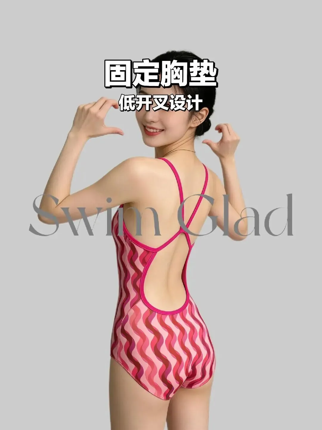 很多人拍泳装照,最怕的不是镜头近,而是手不知道往哪放,肩背一紧,整个人就容易显得用力,这组图是很干净的棚拍背景,配上粉色波纹泳装,颜色本身就很有轻快感,反而很适合普通人直接照着学,