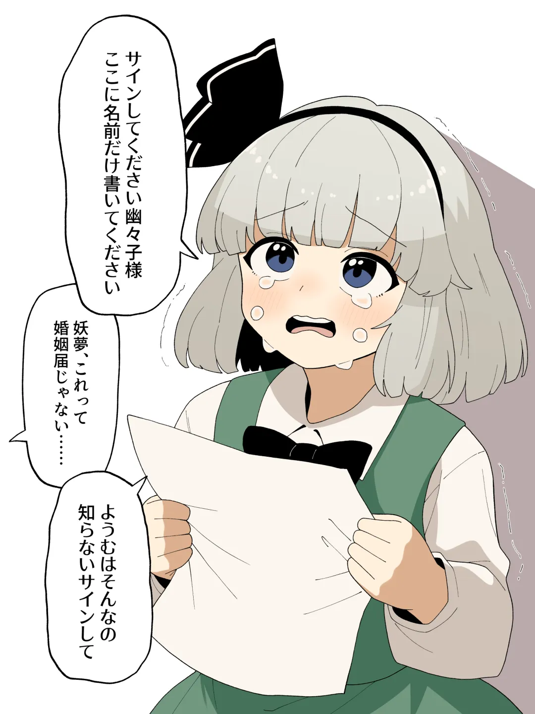 カプリ老师绘制了一张请求幽幽子在结婚登记书上签名的妖梦。