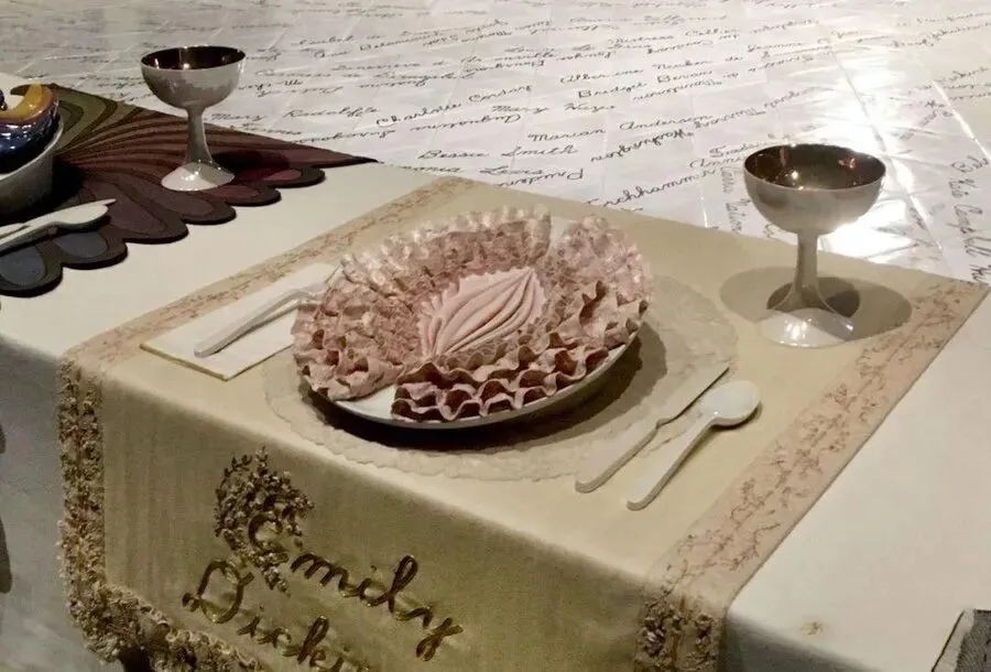 • 朱迪·芝加哥的《晚宴》:直接把女性生殖器做成了盘子,摆上了餐桌。这是对男性凝视的最强反击