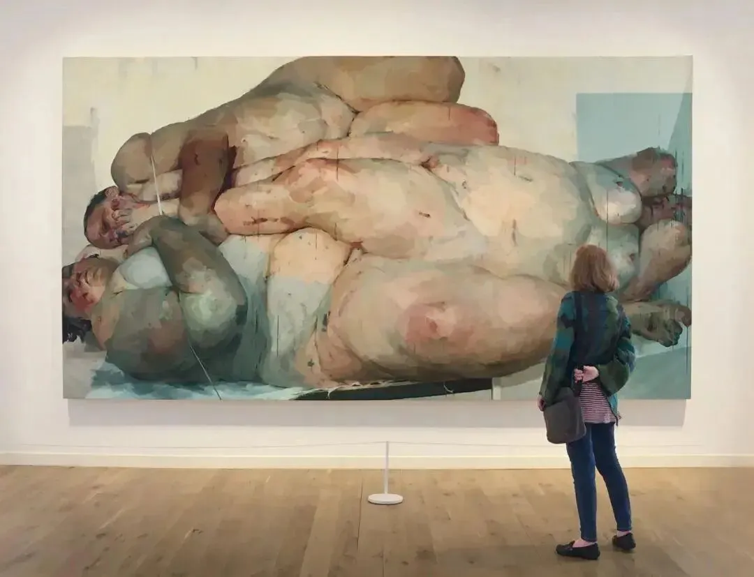 • 珍妮·萨维尔:她画巨大的、充满压迫感的肥胖女性身体,像山一样堆在画布上。她在挑战“瘦才是美”的霸权。
