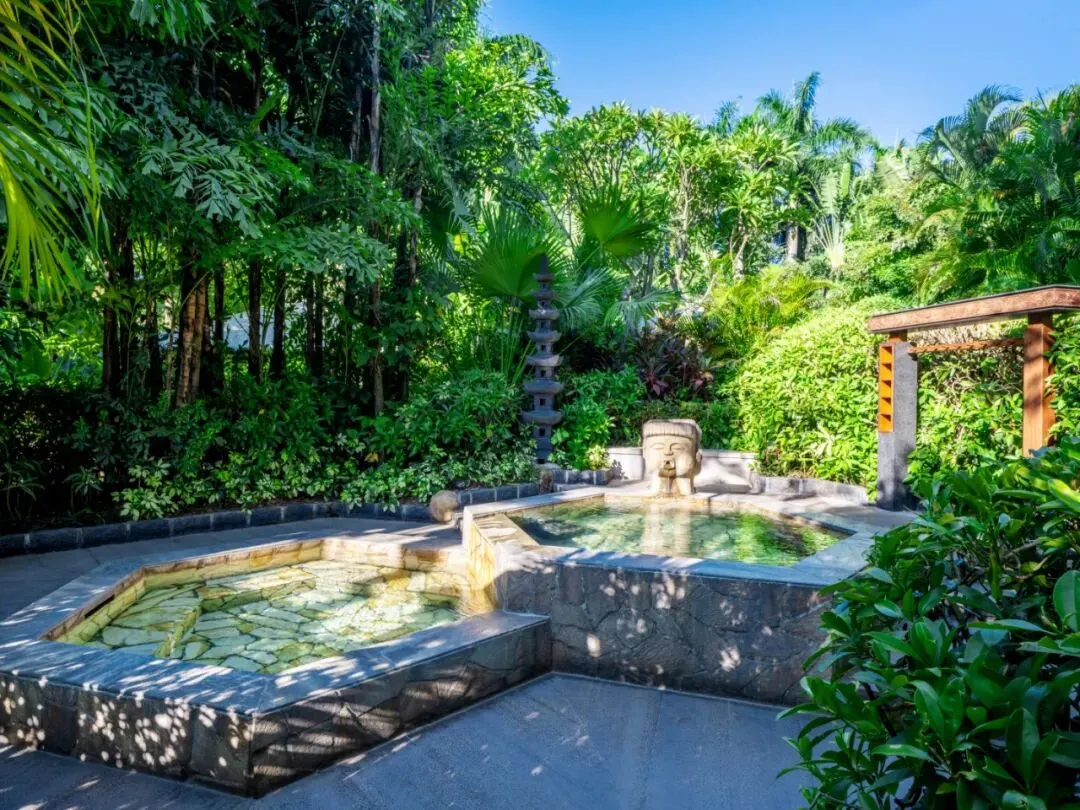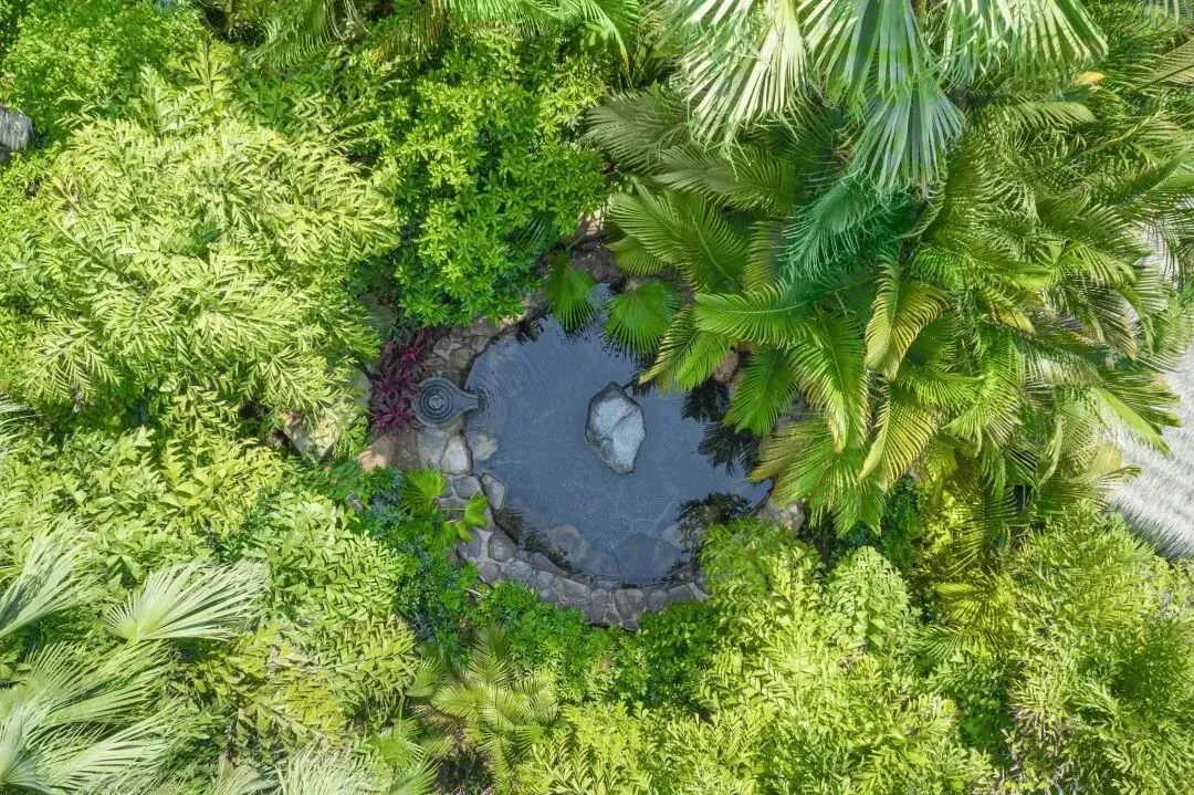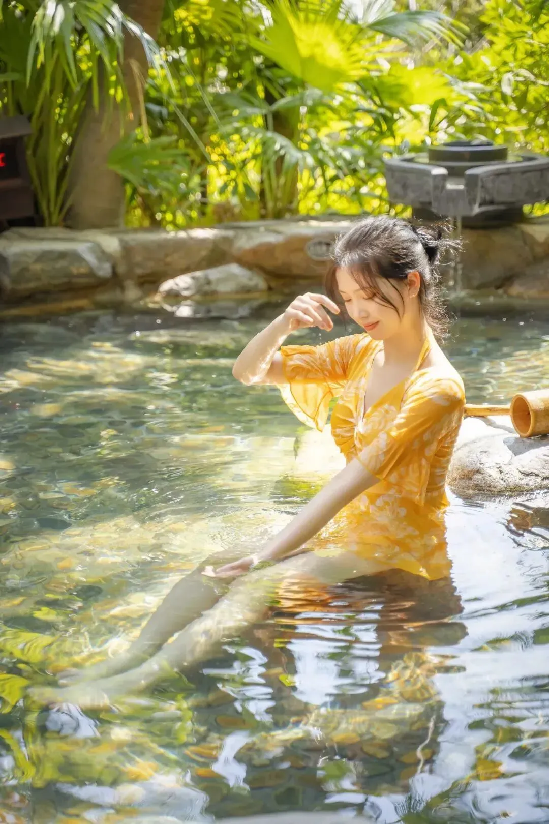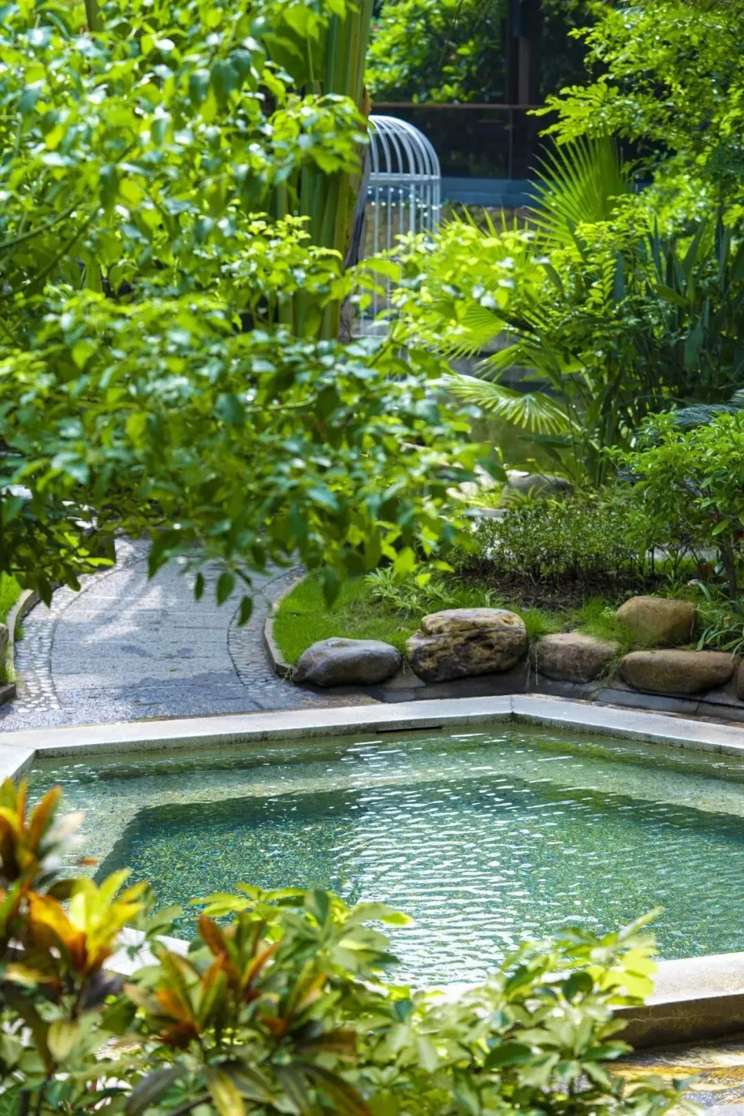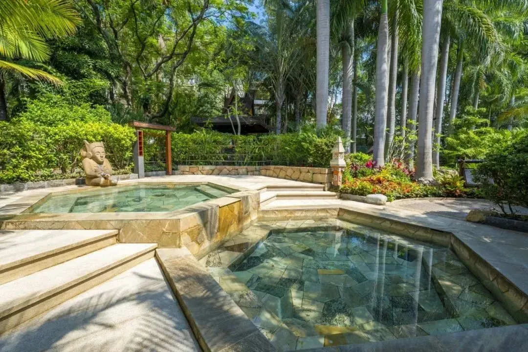 精致的天然石砌成的露天水池,潺潺的温泉水缓缓注入,郁郁葱葱的棕榈科植物,淡淡的花香,婆娑的树影,一切都是那么的宁静自然。