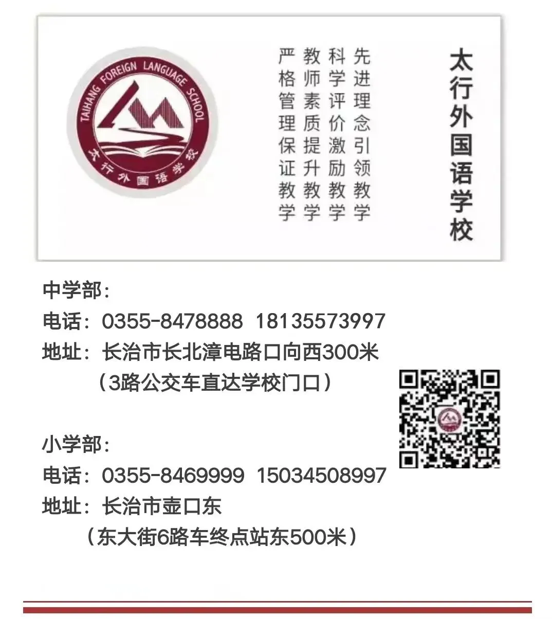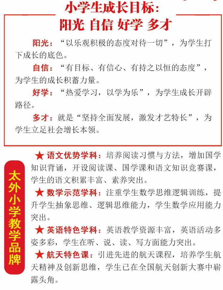 太行外国学校小学部,是以语文学科优秀、数学学科示范、英语学科特色、航天科创教学等为特点的全日制小学,旨在培养学生成为德、智、体、美、劳全面发展且多才、好学、自信、阳光,品学兼优的优秀人才。
