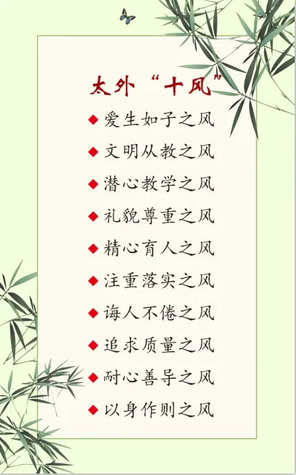“双手扶持千木茂,慈怀灌注万花稠 ”,师以德为本,心以爱为源,用心教书,用爱育人,严慈相济,教学相长, 抱朴守正,笃学敏行。把简单的事情做彻底,把平凡的事情做经典,把每一件小事都做得更精彩。