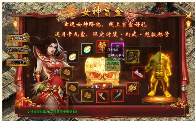 礼包内容:盲盒内含10张幸运奖券,可参与女神盲盒活动,活动必出月卡礼盒,其余时装、称号、各类游戏材料等奖励随机掉落,欧气满满!
