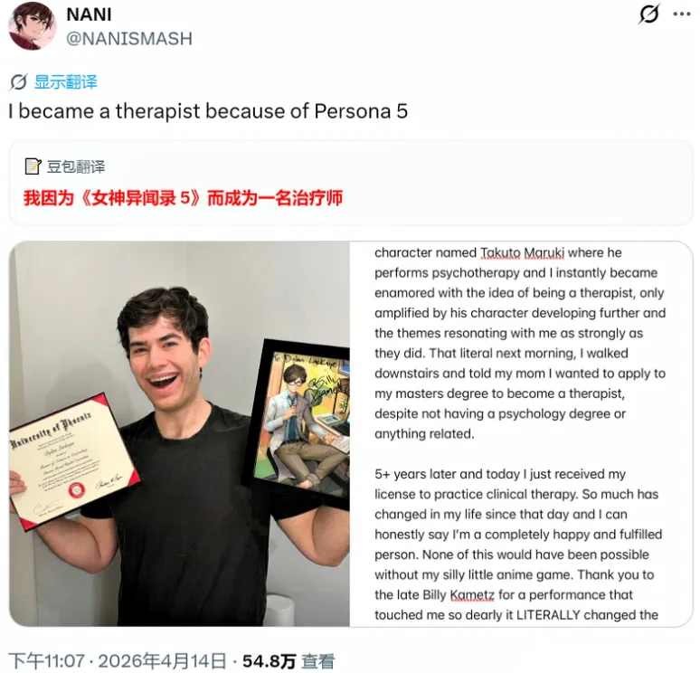 当前位置:首页>美女资讯>因《女神异闻录5》一个虚拟角色,他花5年跨专业考取了心理治疗师执照