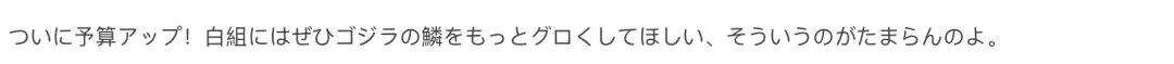 “预算终于增加了!拜托白组这次把哥斯拉的鳞片做得更夸张一点,我就好这一口。”