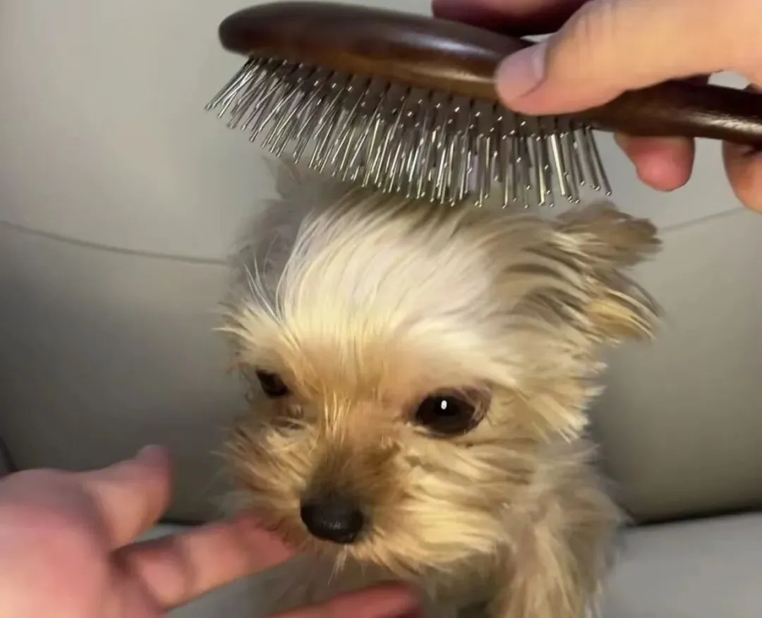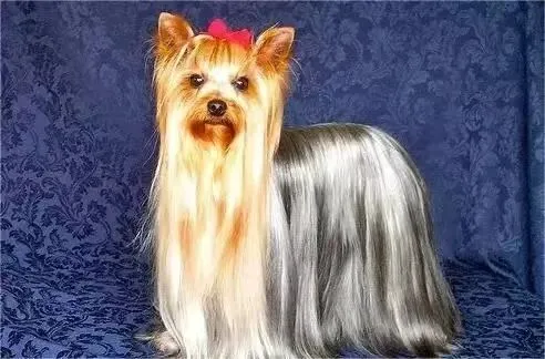 约克夏的毛色是它最大的凡尔赛——小时候一身黑,像块脏脏煤球。一岁半以后才逐渐"开挂",变成钢蓝色背部配金黄四肢,活脱脱翡翠巧克力成精。被毛如丝般垂落,光泽精致,口吻上的毛长得能当地板拖。所以约克夏的正确打开方式,不是撸狗,而是——梳头。头顶毛可以扎起来,也可以中分梳成两个小揪揪,名副其实的"造型自由度极高"。