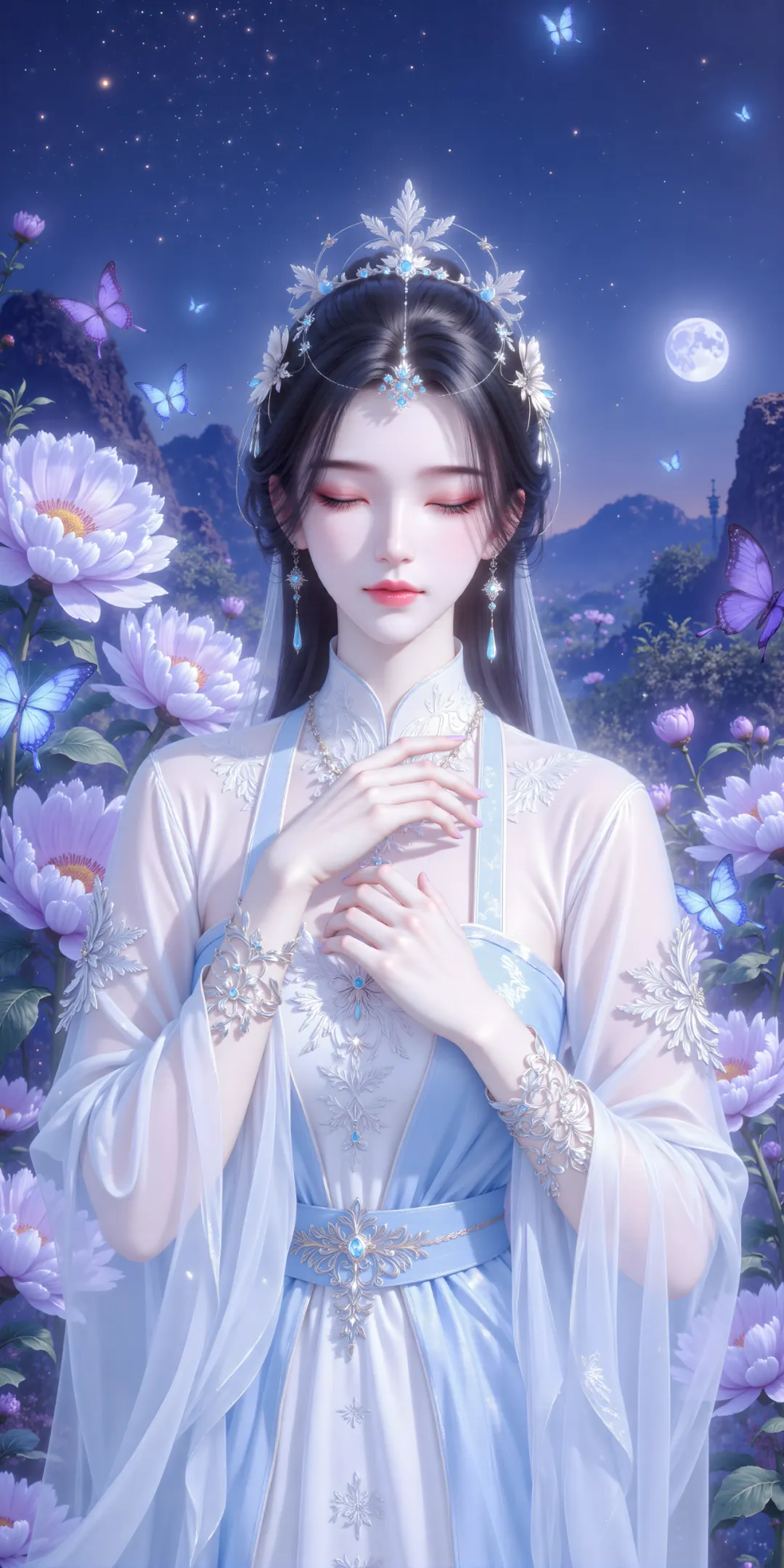 她身着一袭轻盈飘逸的浅蓝与白色相间的古风长裙,裙摆如云雾般柔滑,肩部与手臂处装饰着精致的银白色花卉状臂饰,镶嵌着晶莹的蓝宝石,颈间佩戴着同款花叶项链,头饰亦以银花与蓝晶点缀,发丝乌黑柔顺,部分垂落肩头,发间还别着一朵洁白的立体花朵与闪烁的光点。