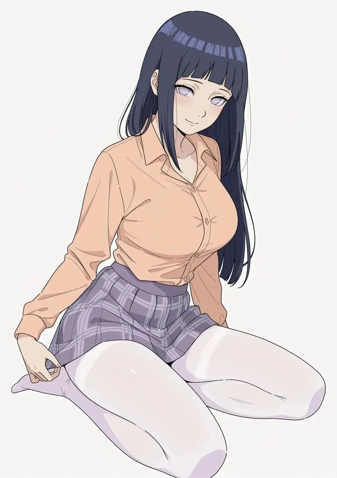 她穿着淡紫色的衬衫,袖口随意挽至小臂,露出纤细的手腕。格子百褶裙的褶皱被风掀起一角,白丝裹着修长的腿,衬得裙摆的格纹愈发柔和。乌黑的长发垂落肩头,发梢轻扫过锁骨,像揉碎的月光淌在肩头。