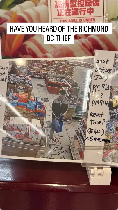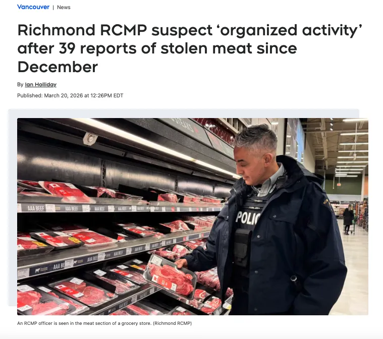 一个月前,Richmond RCMP发布通告称,自去年12月以来,当地已经发生39起肉类盗窃案件,平均接近每3天一次。警方明确表示,这一数量和作案模式,已经显示出“可能存在有组织行为”,被盗商品很可能被转售。