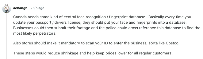“加拿大需要建立一个类似人脸识别/指纹的中央数据库。基本上每次你更新护照或驾照时,都应该把你的面部和指纹录入进去。商家可以提交监控视频,警方再通过数据库比对来找出最可能的嫌疑人。 另外,商店也应该像Costco一样,强制顾客进店刷ID。这些措施可以减少损耗,也能帮助普通消费者降低价格。”