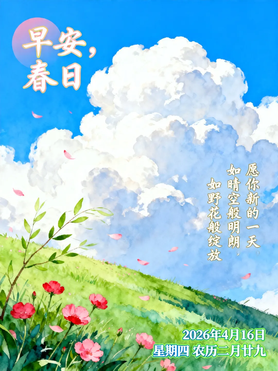 当前位置:首页>美女资讯>2026年4月16日长方形早安图片带日期:愿这个清晨,能带给你一身轻松,一世安康,四季无忧.
