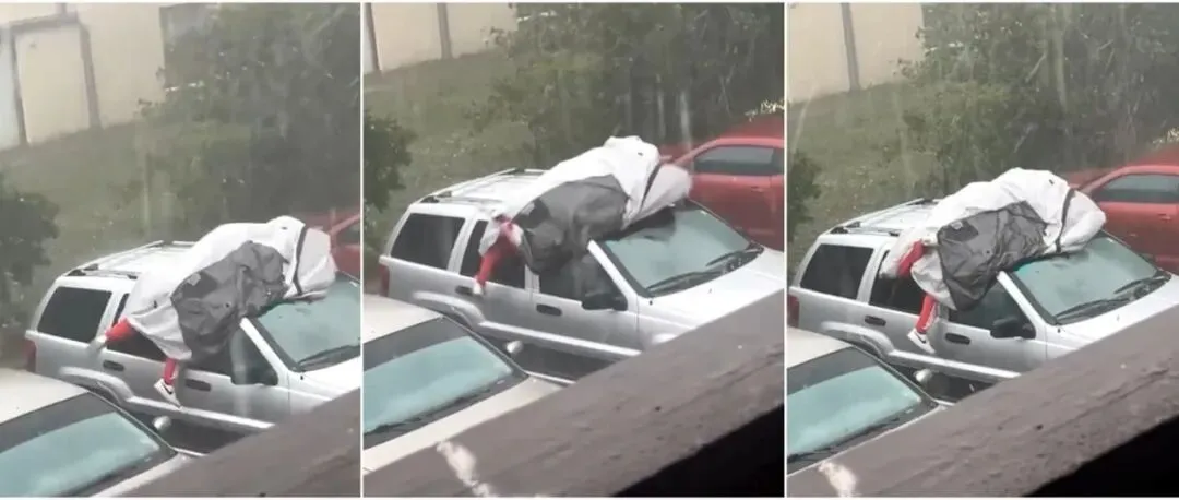 美国男子趴车顶用身体硬扛冰雹,听完原因后网友沉默了:活在美国不容易...