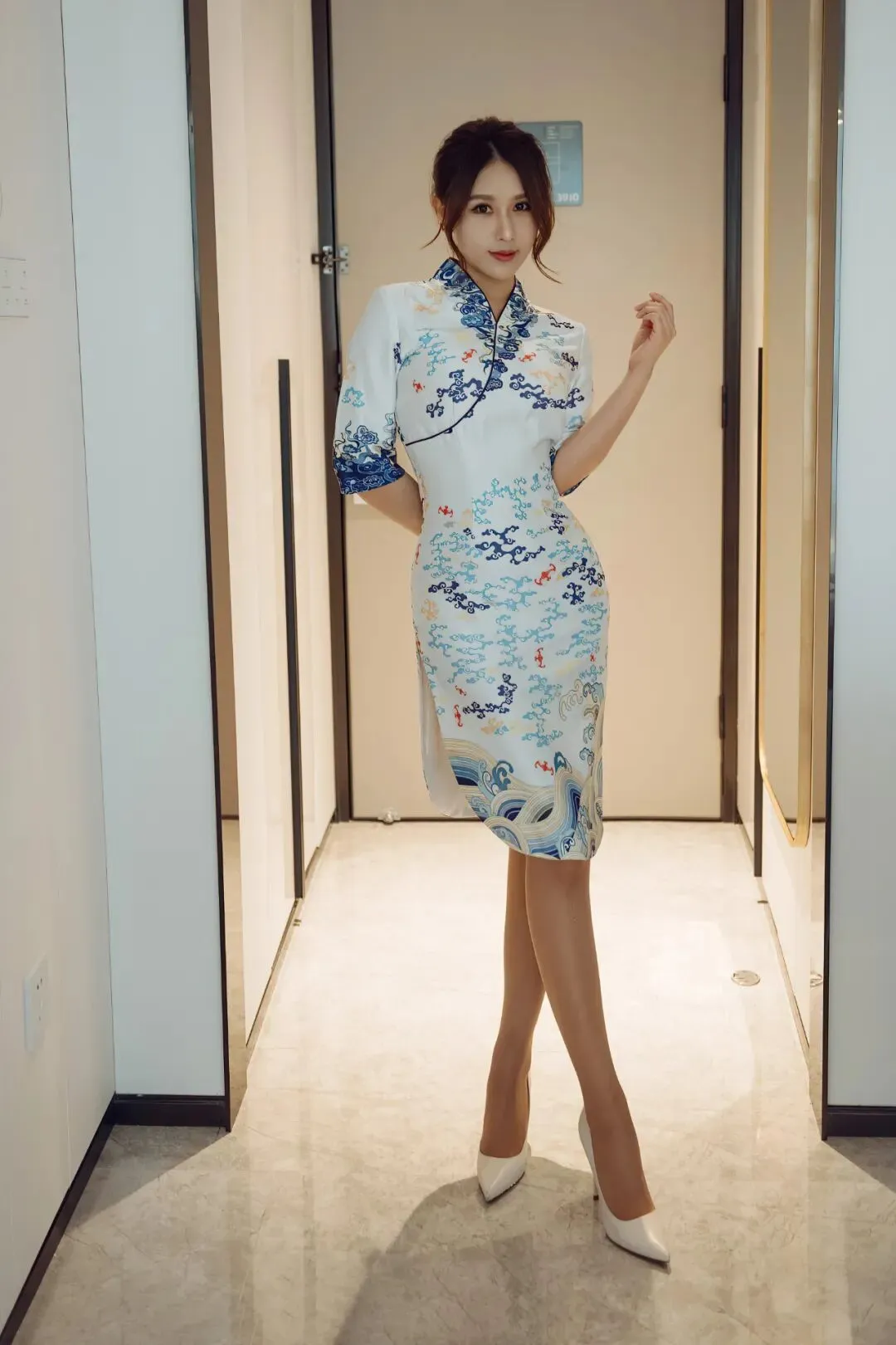 改良款高开衩短款旗袍,修身的剪裁,穿在徐安安身上,太好看了,简直就是为她量身定做的一般,完美的贴合她的身材曲线。