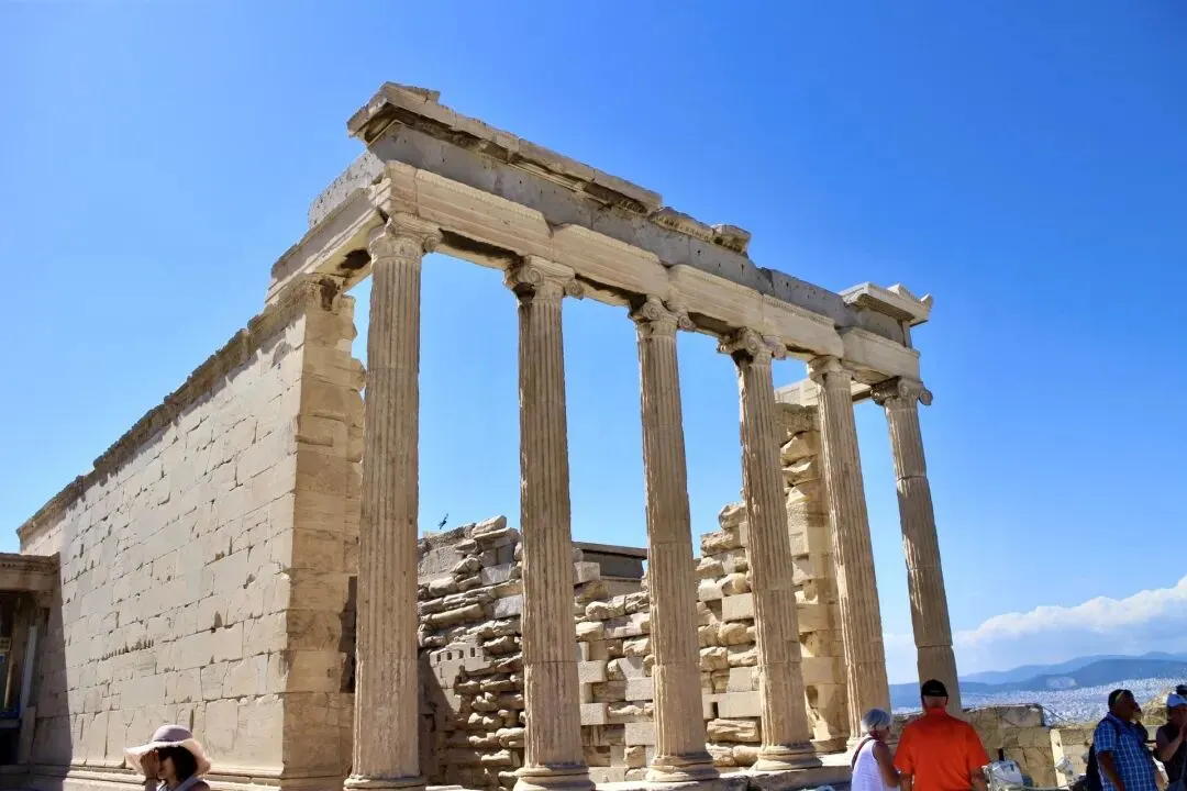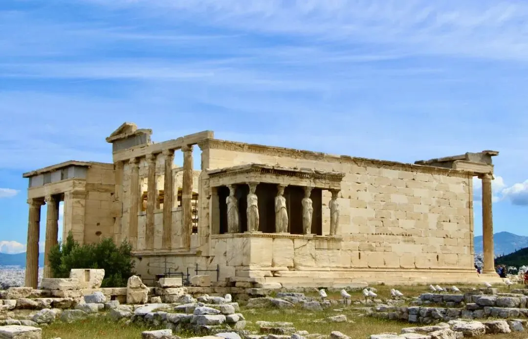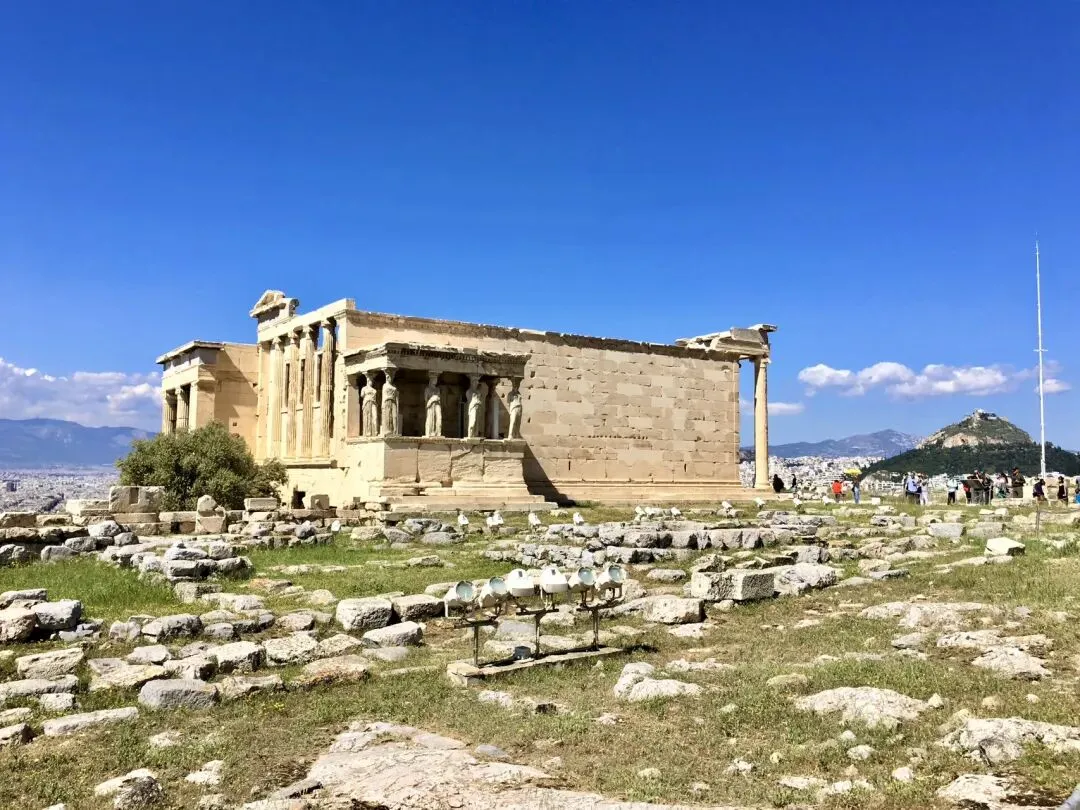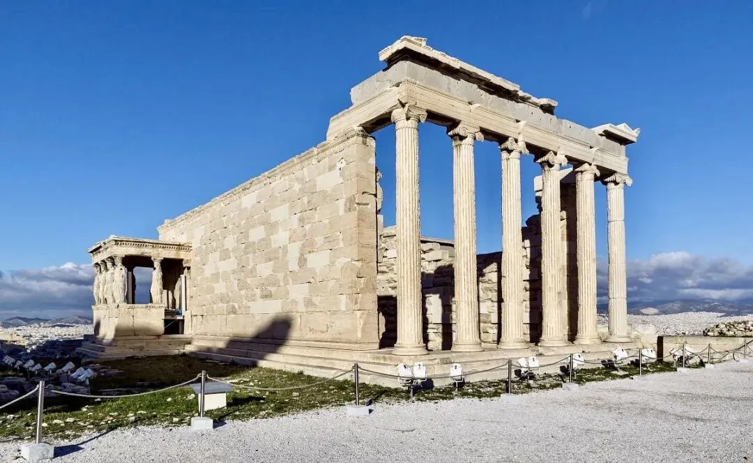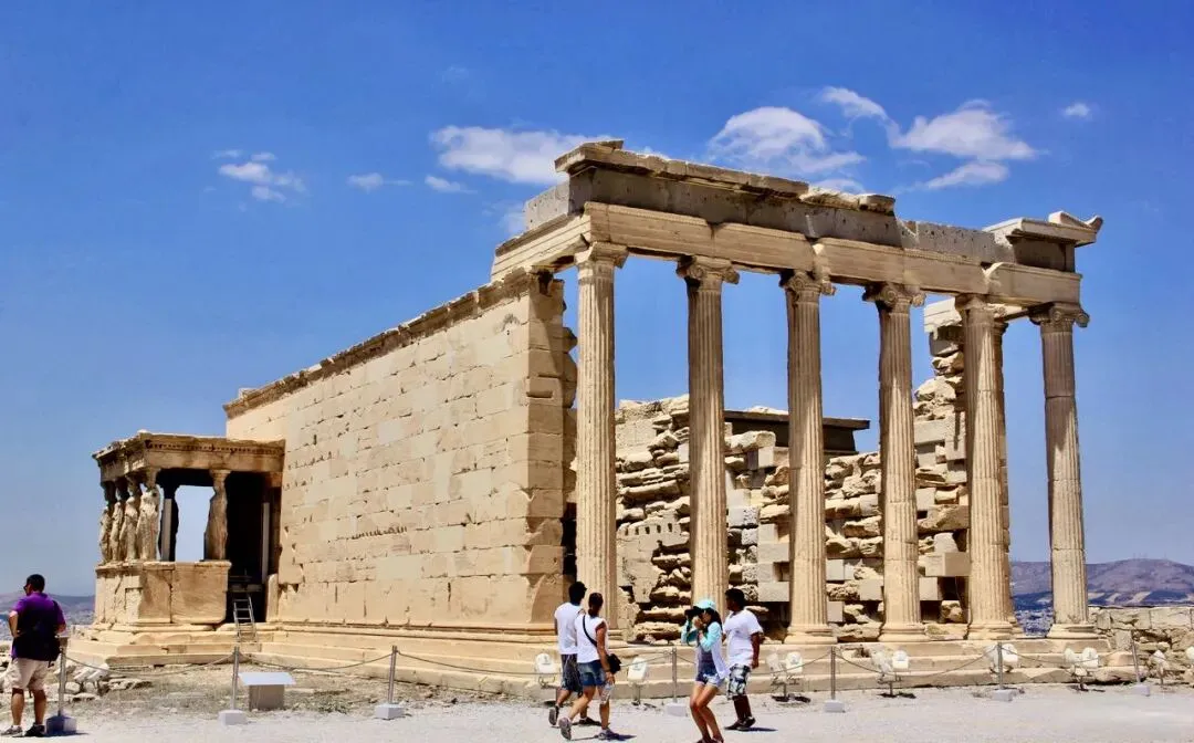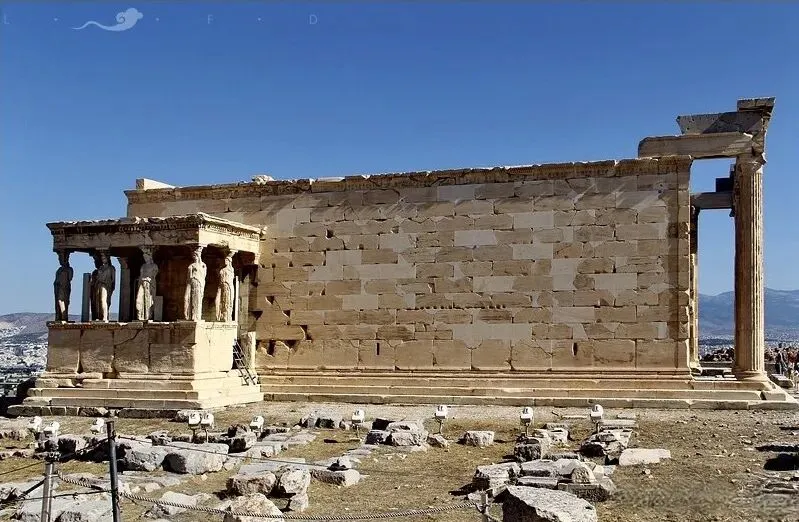 为了避免空气污染及保存古迹,雅典卫城伊瑞克提翁神庙上的六个少女廊柱”都是仿制替代物。