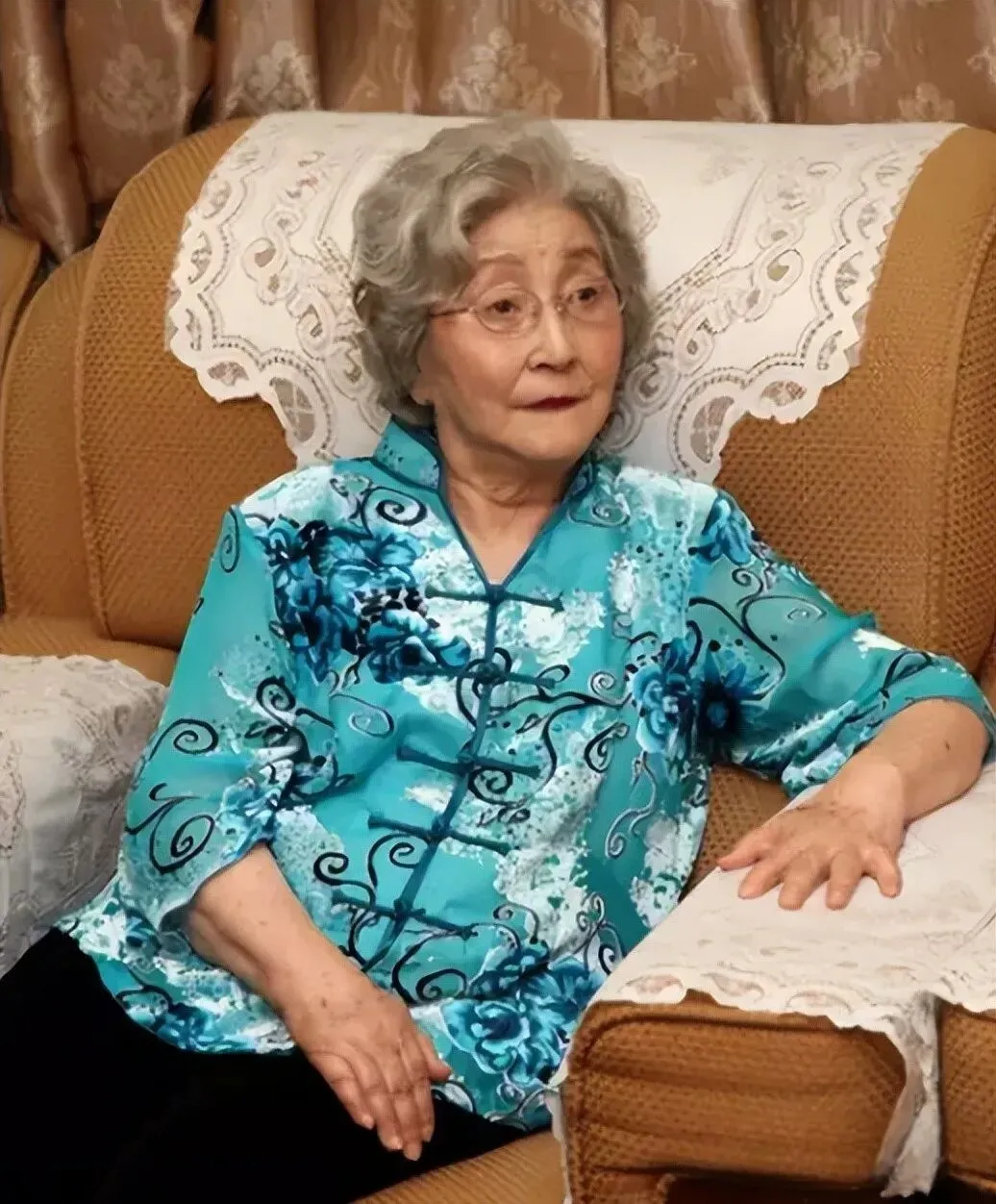 这张单人照,穿着蓝花衣裳,坐在沙发上,手搭在扶手上,岁月在她脸上刻了皱纹,可没带走那股子优雅,那是读书读出来的气质,是唱歌唱出来的韵味,老也老得这么好看