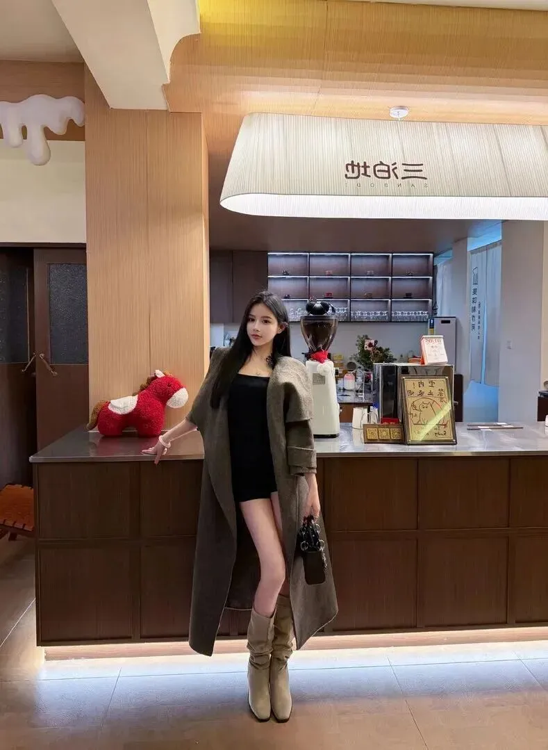日常生活出行,舒适第一。深灰色大衣外套采用毛料,质地柔软,垂坠感极好,穿着非常有质感。里面穿什么不需要太讲究,大衣一罩,露出一点点腿就可以了。穿着浅卡其色高筒靴,与大衣颜色相呼应的简约大方的装扮。一只手提黑亮手提包,肩上佩戴一个红毛绒玩偶的包包,顿时添了几分可爱。走在咖啡店简明而不凡的简练里,让人眼前一亮。
