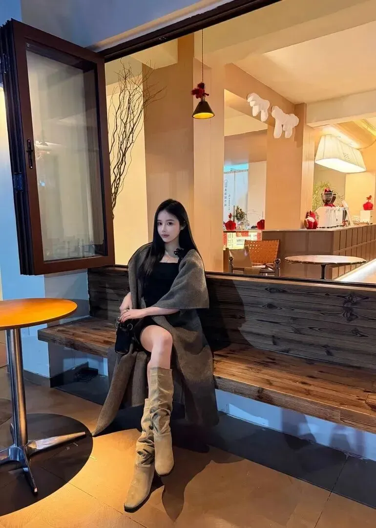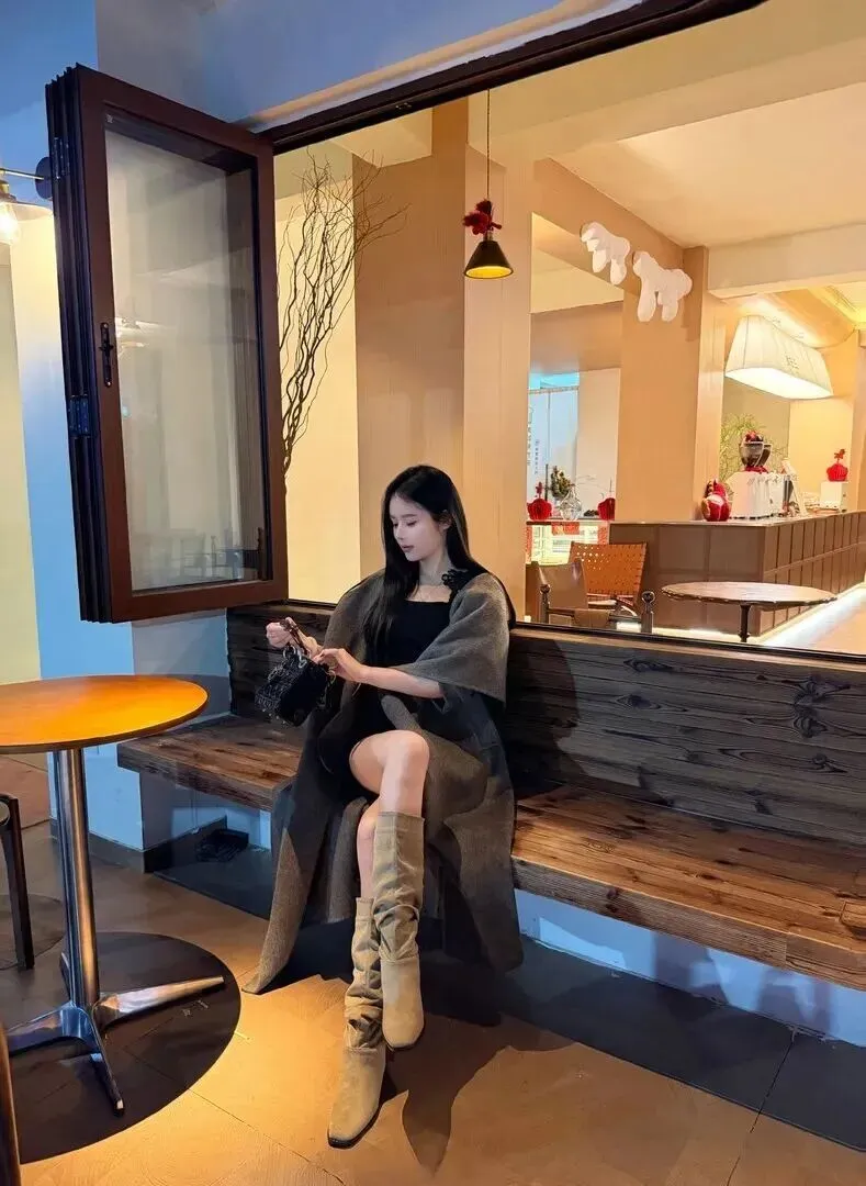 下午茶时的着装应该温柔一些。黑色方领短上衣、深灰色毛呢大衣非常整洁干净利落。卡其色的绒面堆堆靴和大衣颜色搭配起来十分协调,非常和谐。手持一块黑色菱格纹链条包更加明显。坐在木质长椅上低头一笑,气度不凡,使人情不自禁地想要靠近。一身适合品咖啡、聊聊天、散步赏秋。