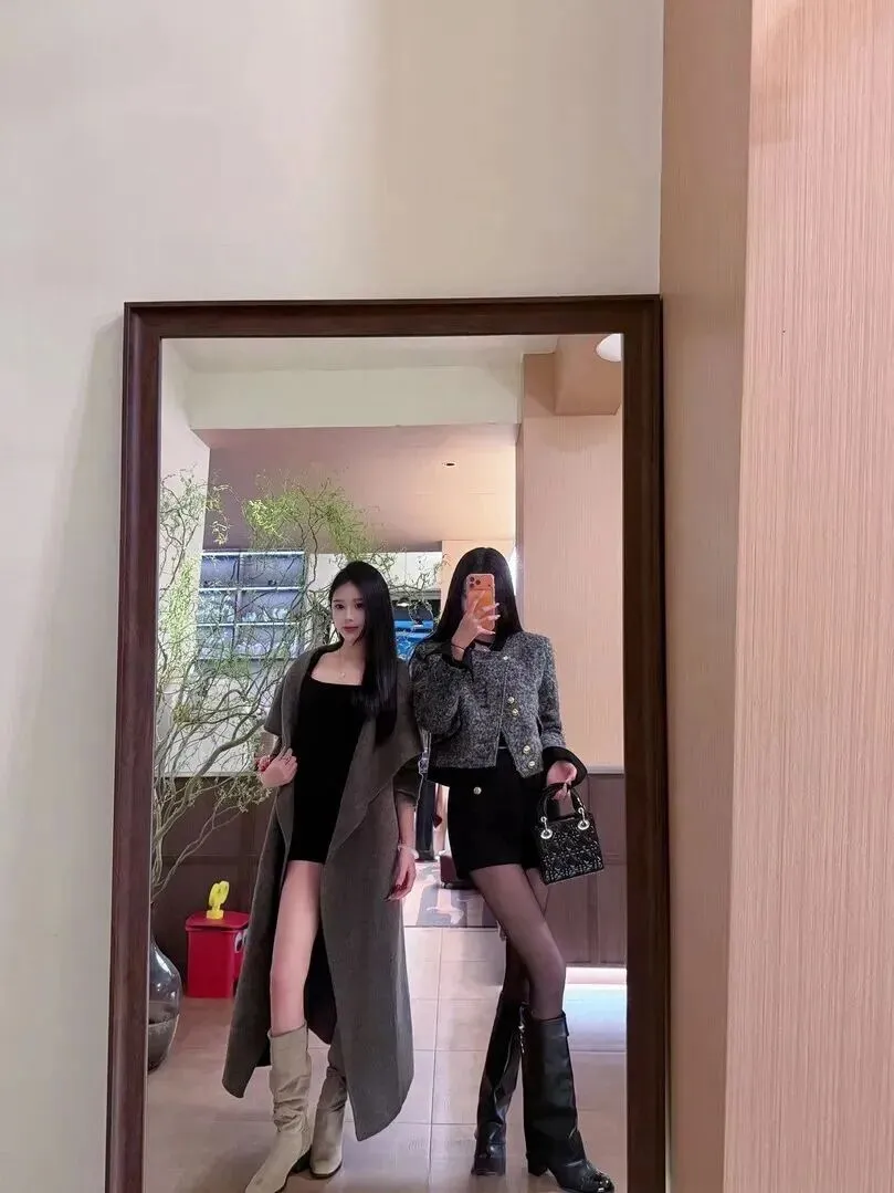 与闺蜜出门逛街时穿搭也要默契一些。左边那个女同学着黑衣外加件反光大的灰色外套。脚上穿着米杏色麂皮堆堆靴,大衣的颜色和它存在明显的对比,层次感立刻显现出来。右侧大姐姐所穿的衣服更具有时尚感,短款小香风外套、黑高腰短裤、薄丝袜+亮面高筒靴。是复古又有点俏皮的一种打扮。两个人在一起,一个是长款,一个是短款,但是风格却很搭,街上的人都会对这样的搭配产生更多的关注。