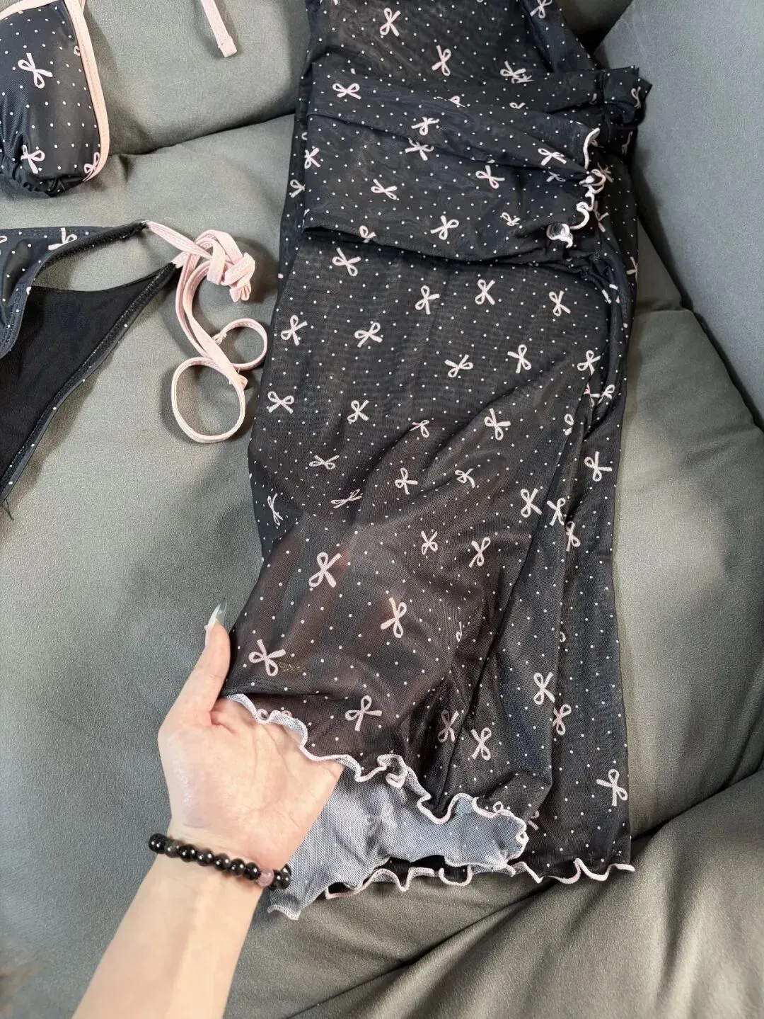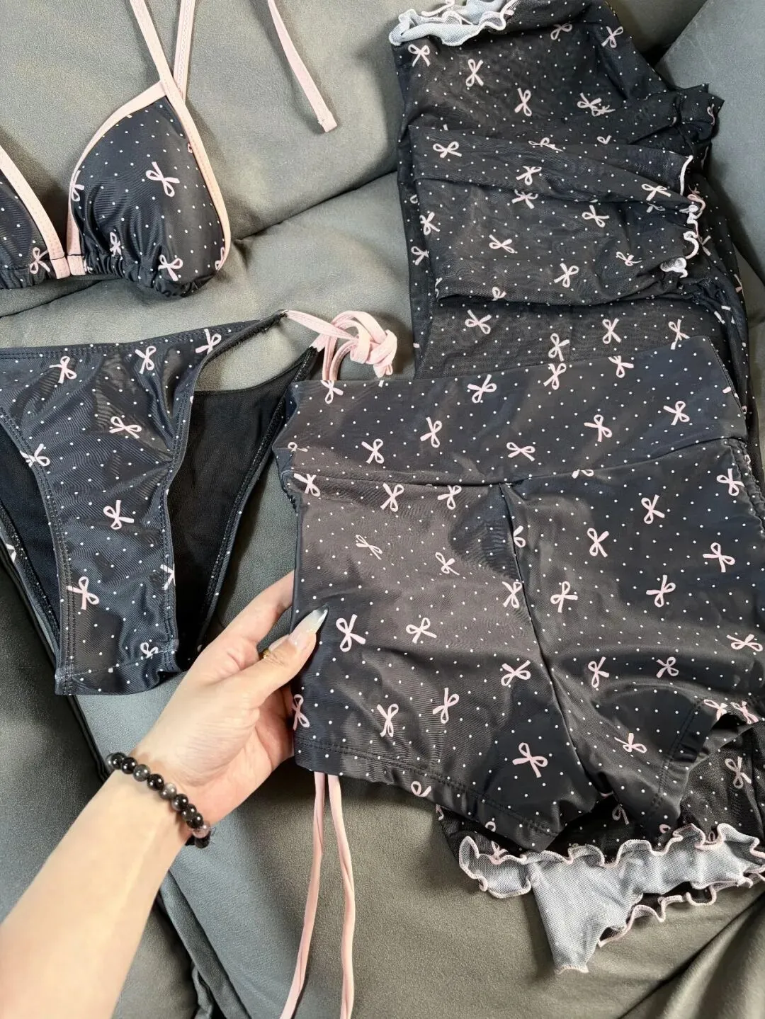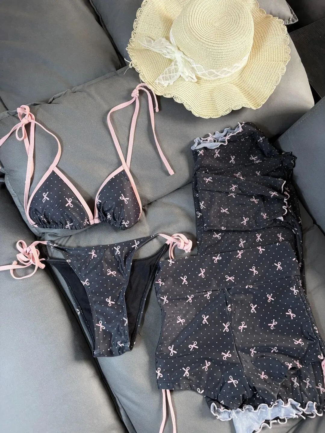 这种拍法很适合做整组照片的起手式,第一眼就把穿搭风格交代清楚了,黑底粉边和小蝴蝶结图案,本身就很上镜,像还没出门前的度假预告,画面会显得很有呼吸感,