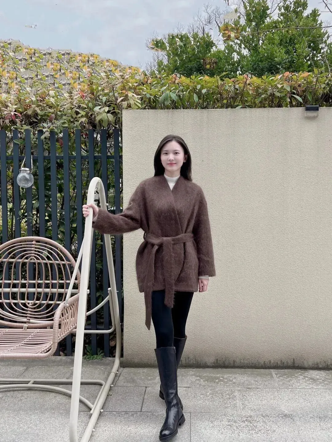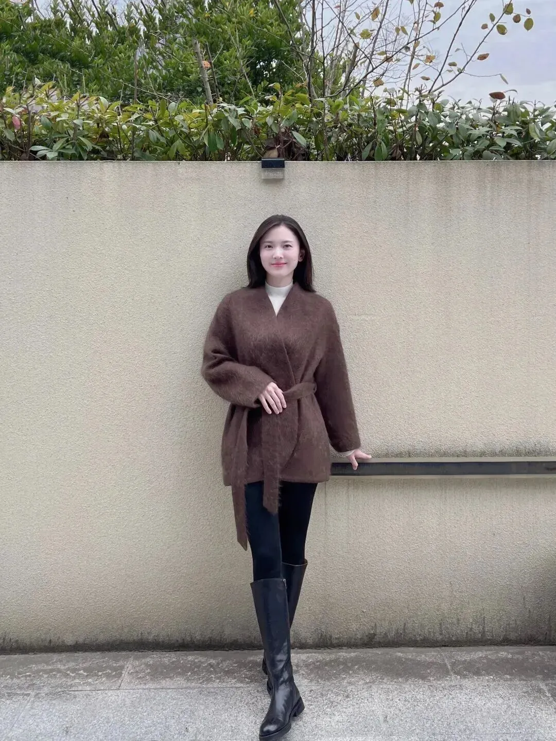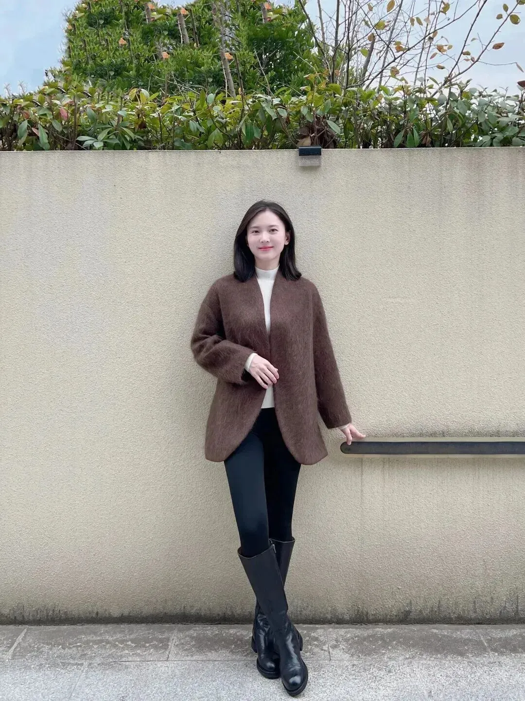 下面穿上一条黑色紧身裤,裤子线条十分干脆利索,使腿部显得又长又直。脚上穿的是一双黑色高筒皮靴,皮子发亮发亮的,和毛绒外套配合起来非常协调。软软的外套加帅气的靴子等于温柔中带有酷感。