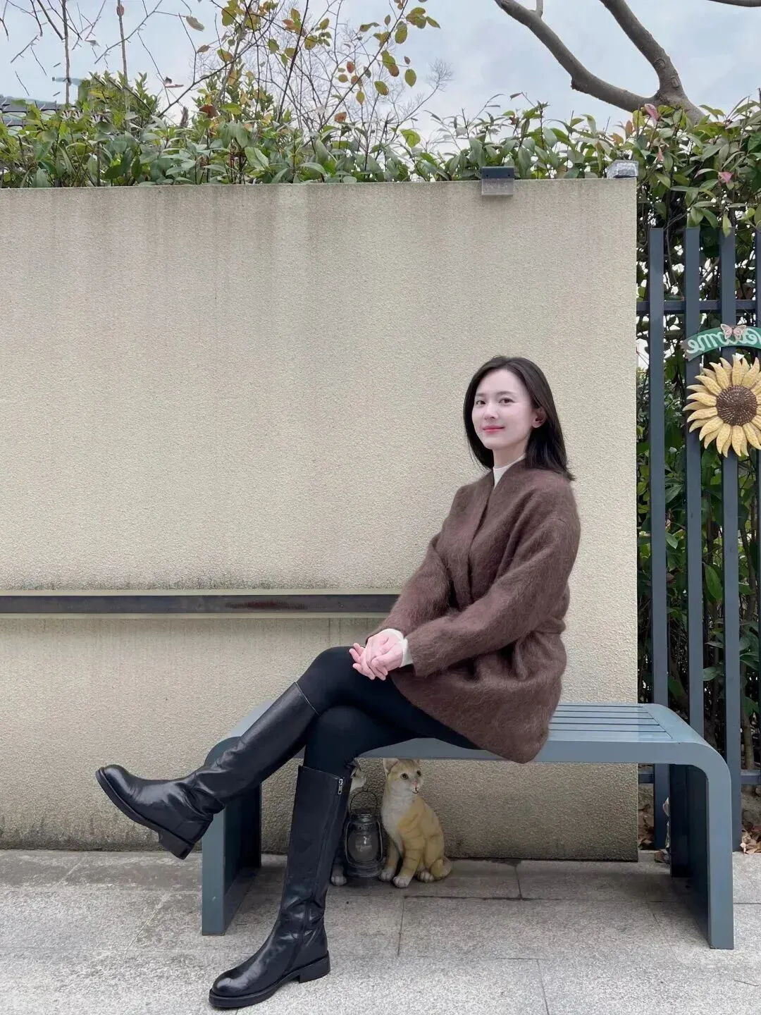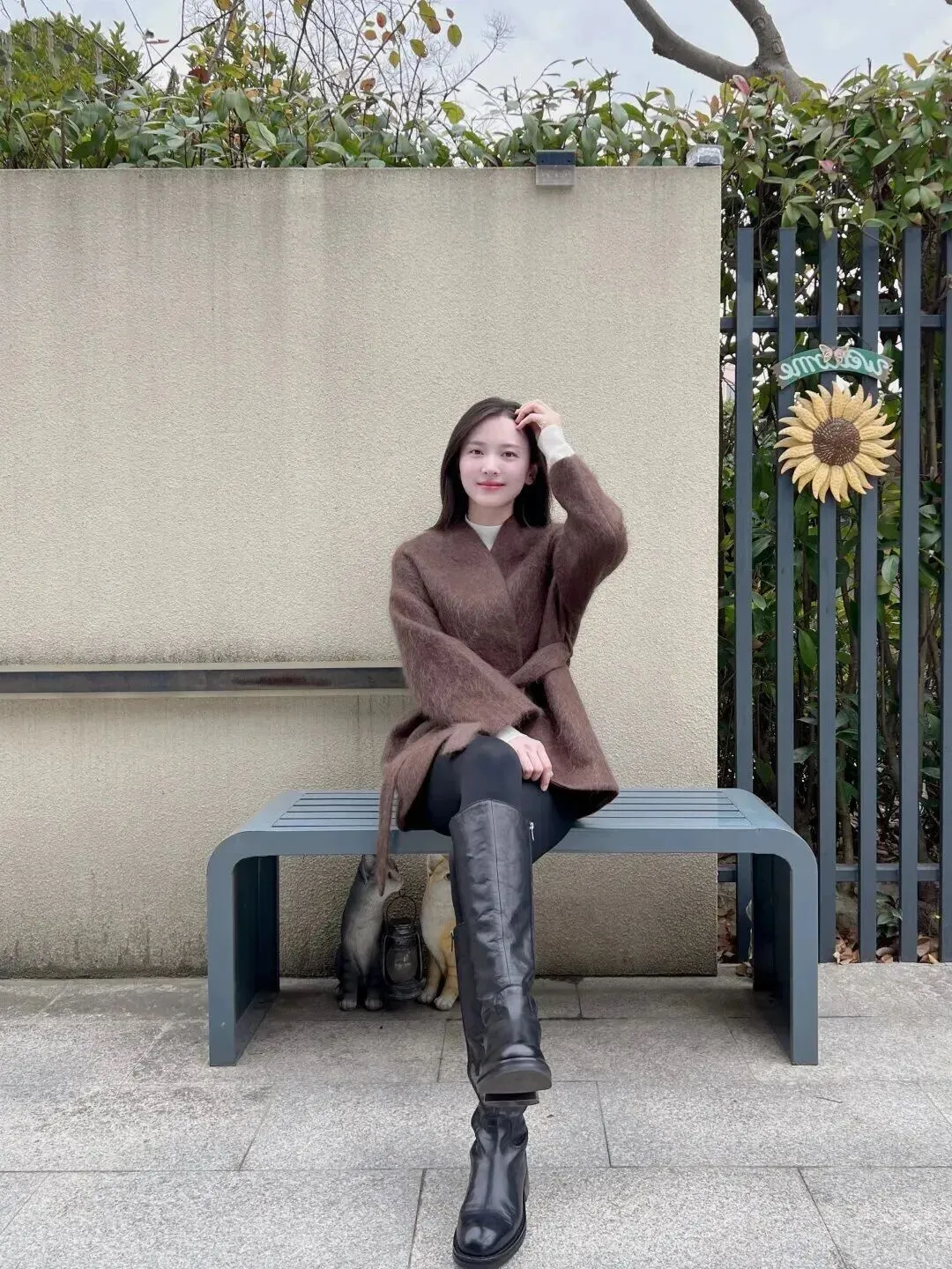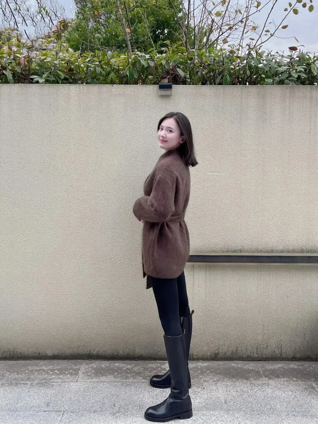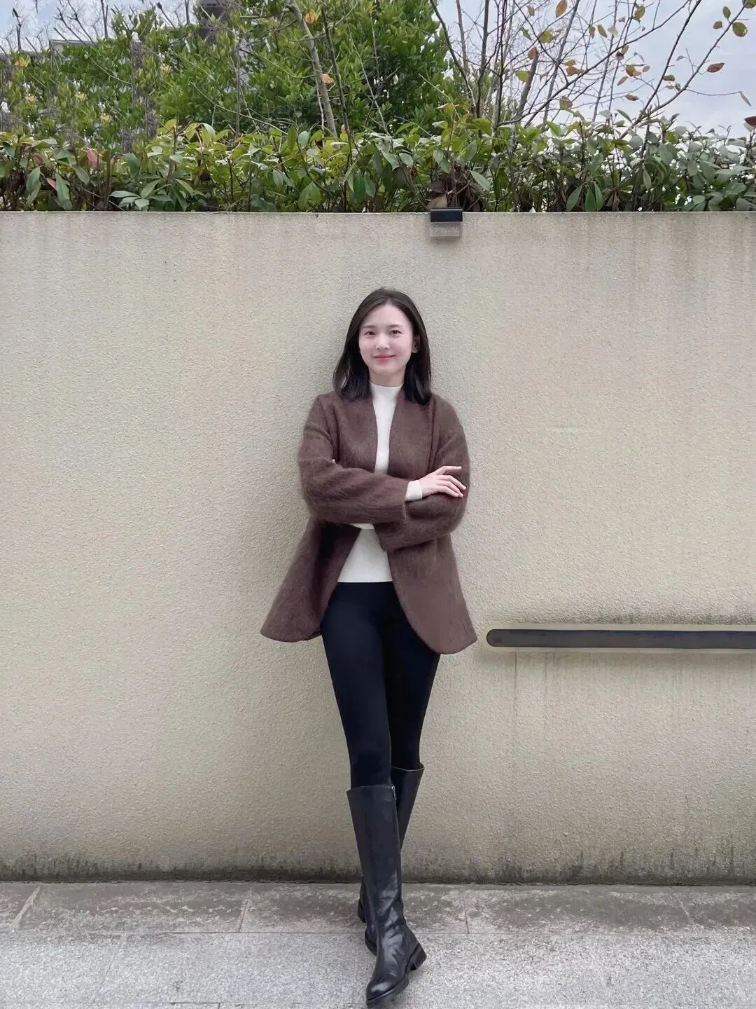 下面穿上一条黑色紧身裤,裤子线条十分干脆利索,使腿部显得又长又直。脚上穿的是一双黑色高筒皮靴,皮子发亮发亮的,和毛绒外套配合起来非常协调。软软的外套加帅气的靴子等于温柔中带有酷感。