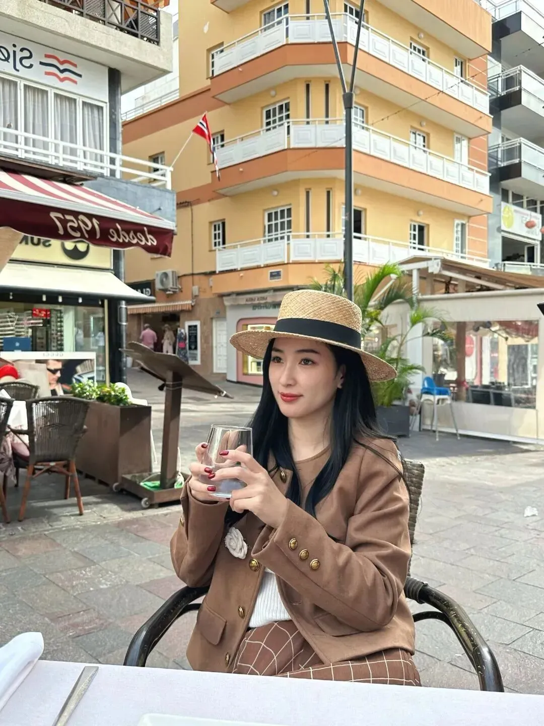 穿着的是一件浅棕色短款西服,看上去应该比较合身舒适,袖口处的小纽扣会有一点点光亮。里面是浅棕色的打底衫,下摆有几处米白色针织边,层次感很强。裙子颜色是深棕色的,有白色的细碎花小格子,复古又带有时尚感。提着玻璃杯的红指甲、红嘴唇的人身姿处于一种十分舒适的状态中。