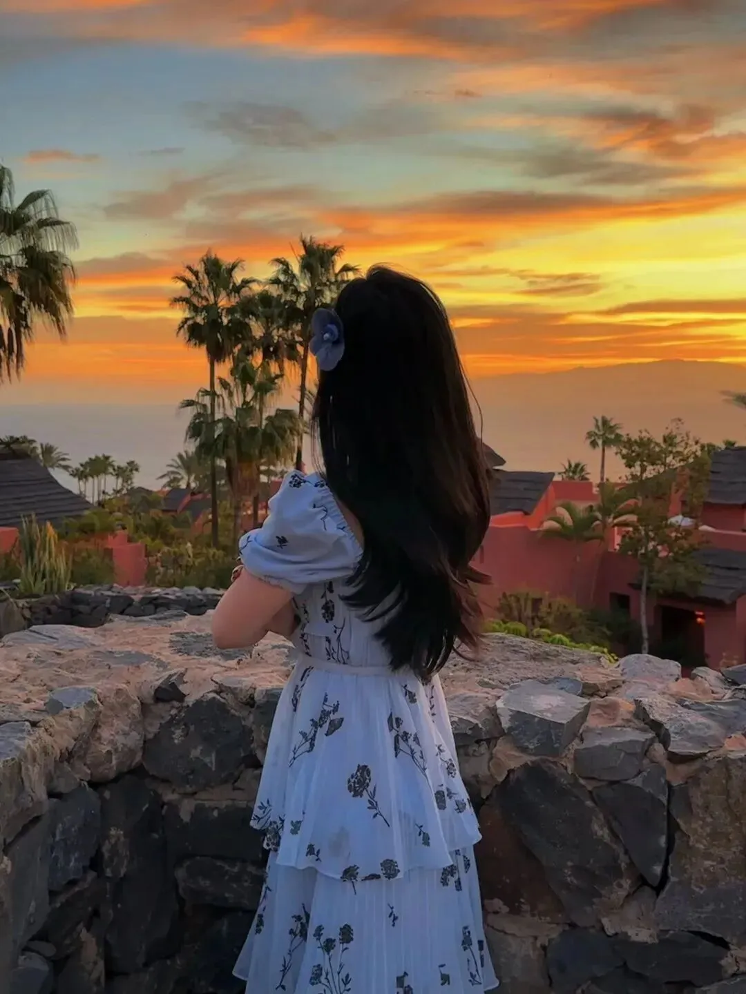 转身之后卷发随着风飘扬,小花的顶部用灰蓝和清亮两种颜色相结合而成,既有特点又晶莹透明。裙子用雪纺材料,浅色带黑图案,泡泡袖、方领、裙摆有层层荷叶边,飘逸的就像一段旧梦。靠着墙看海的画面是那么安静,使人怦然心动。