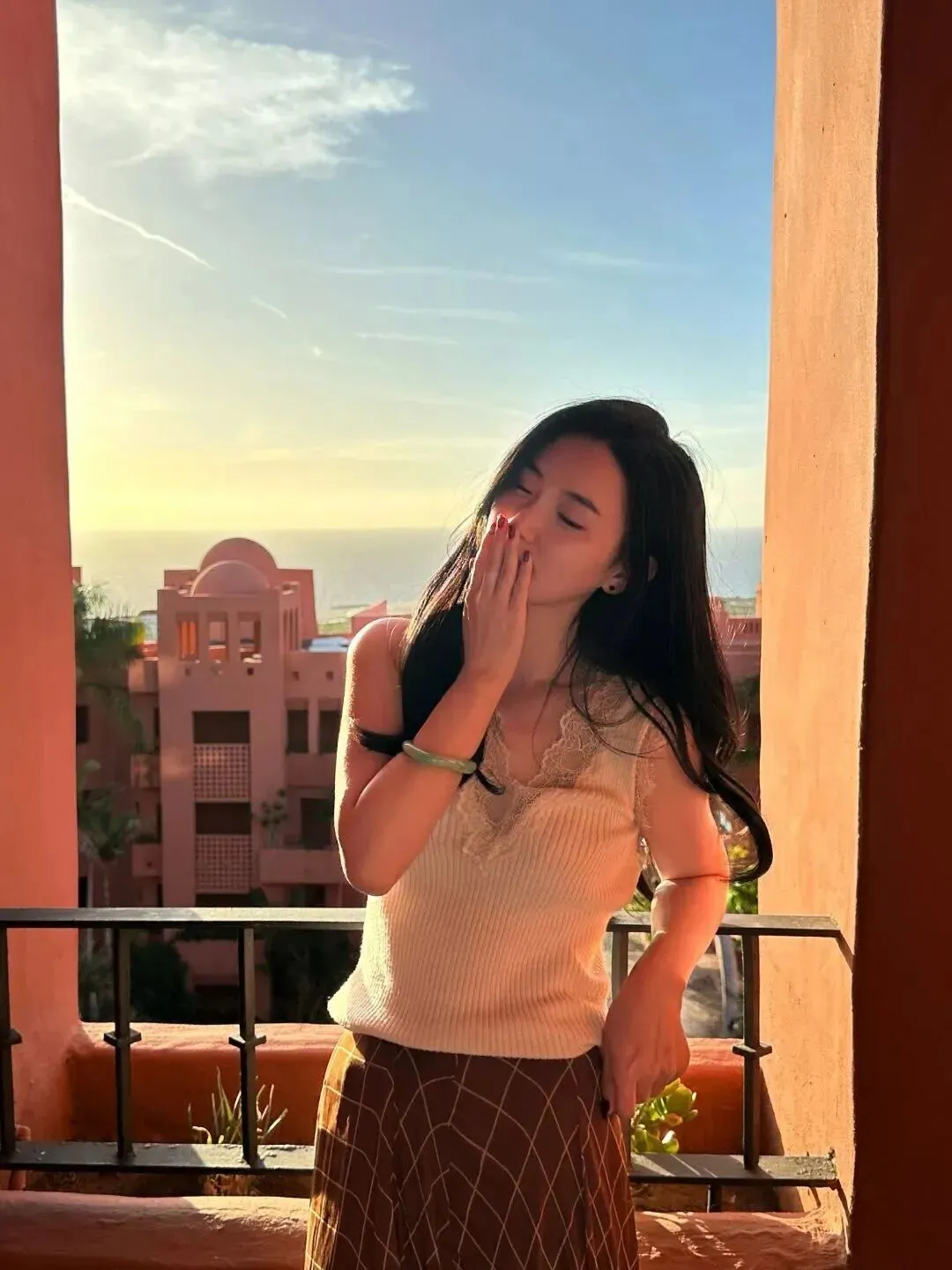 黄昏的时候,她站在露台上,夕阳给她的头发镀上一层金色。选用了一种更为柔和的组合形式,在白色针织背心的基础上,把V领带上嵌入了诸多的小花朵来展示,从而呈现出露出部分锁骨的效果。裙子是深棕色的,有浅米色菱格纹,整体暖暖的很有质感。她轻轻捂住了嘴,似乎在笑些什么。