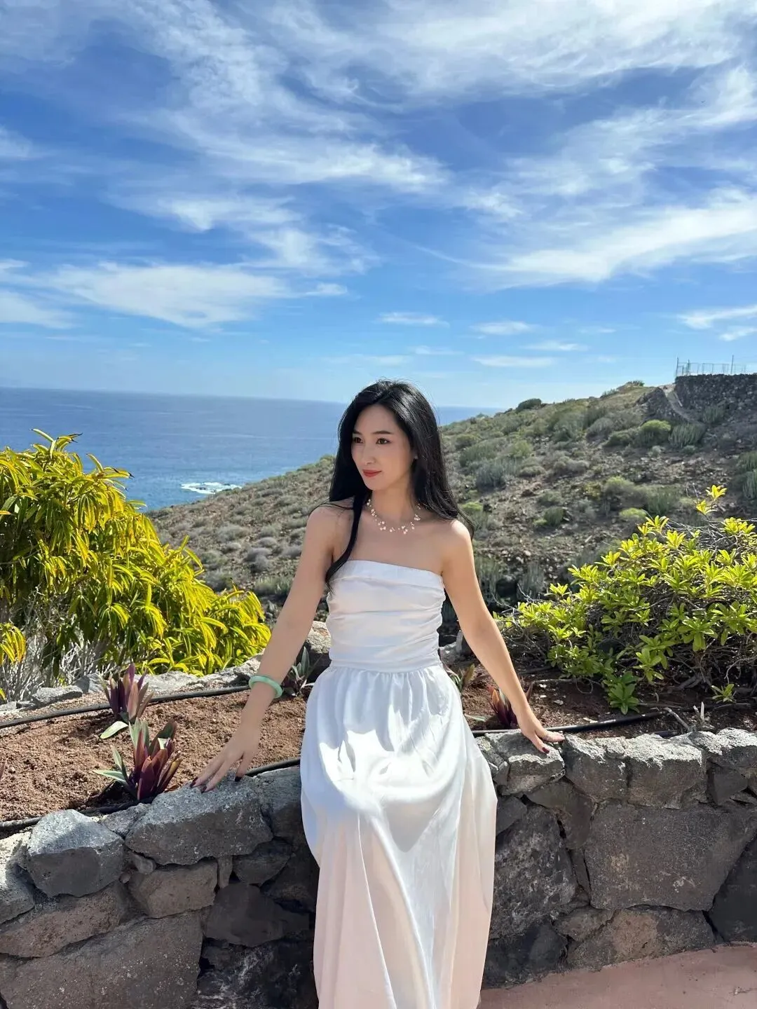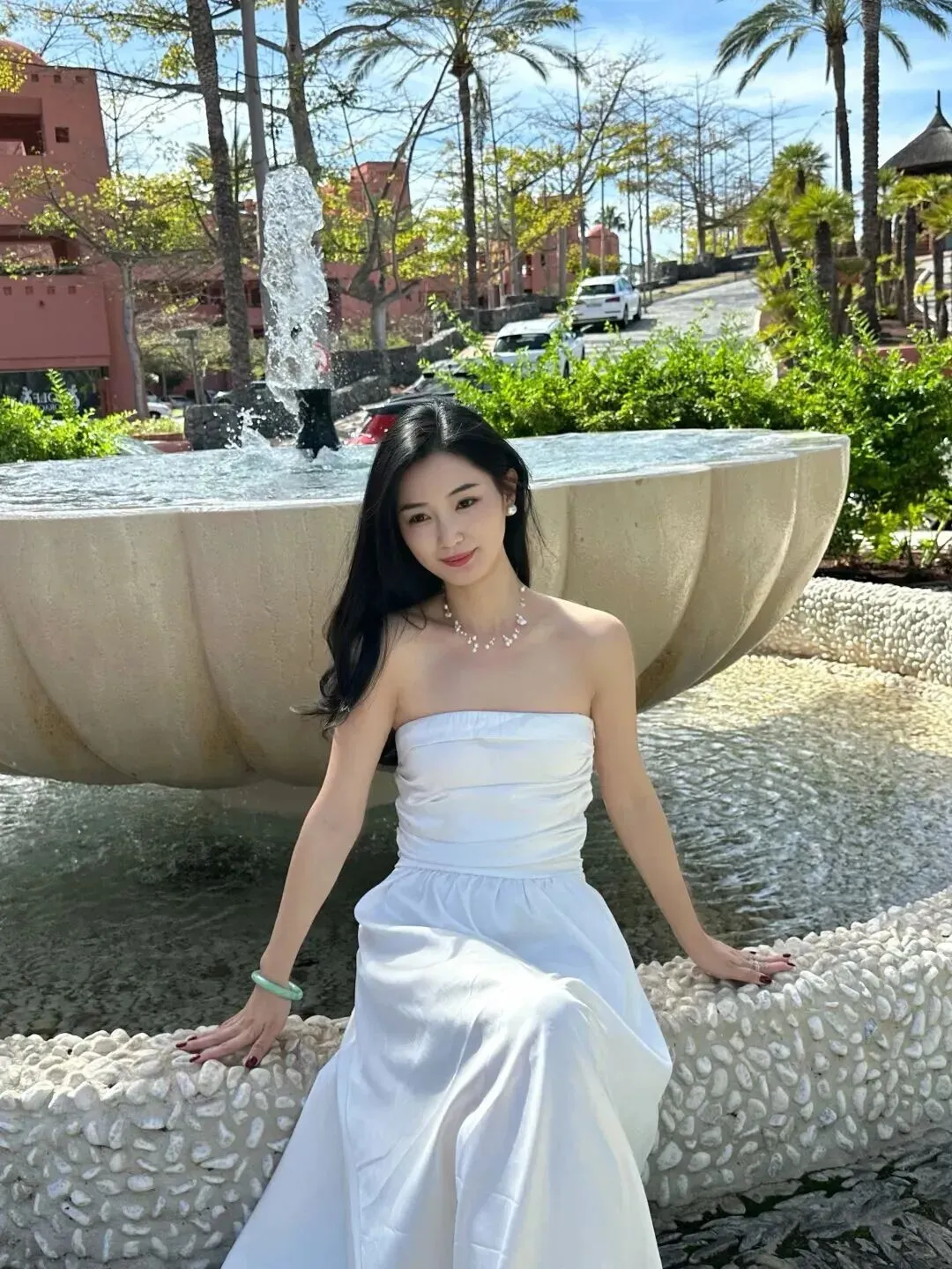 喷泉旁还是米白色的缎面长裙,腰部稍紧,裙摆曳地。背景是喷泉、水池,画面很惬意。用手撑住石台上的玉镯就位了。