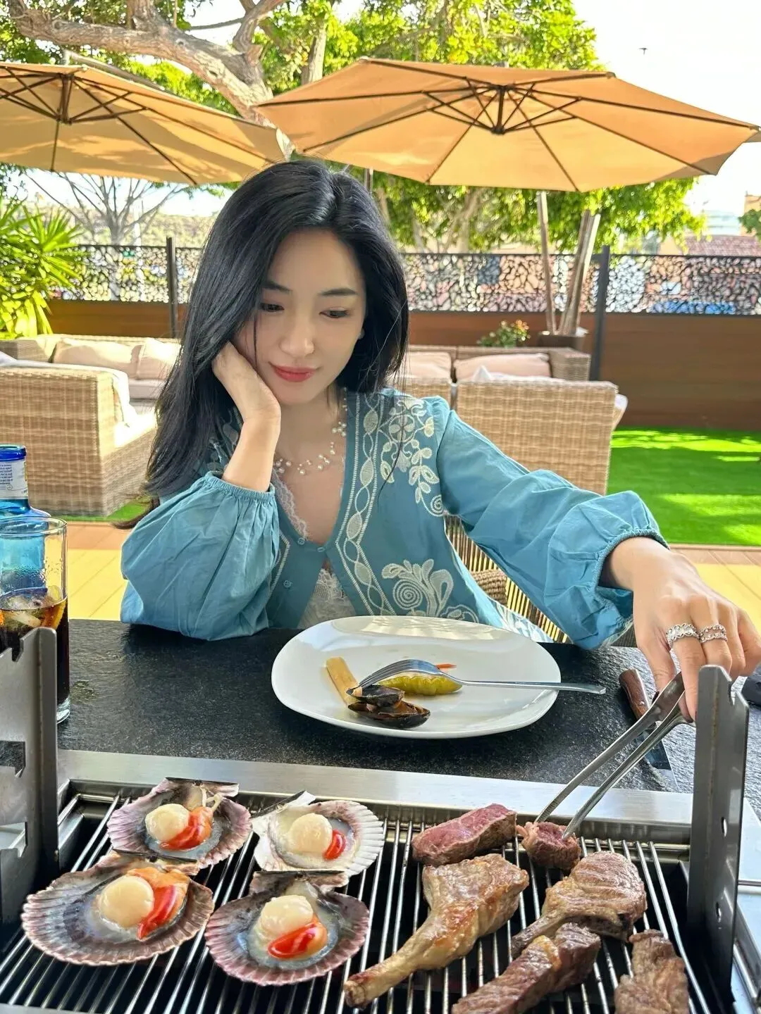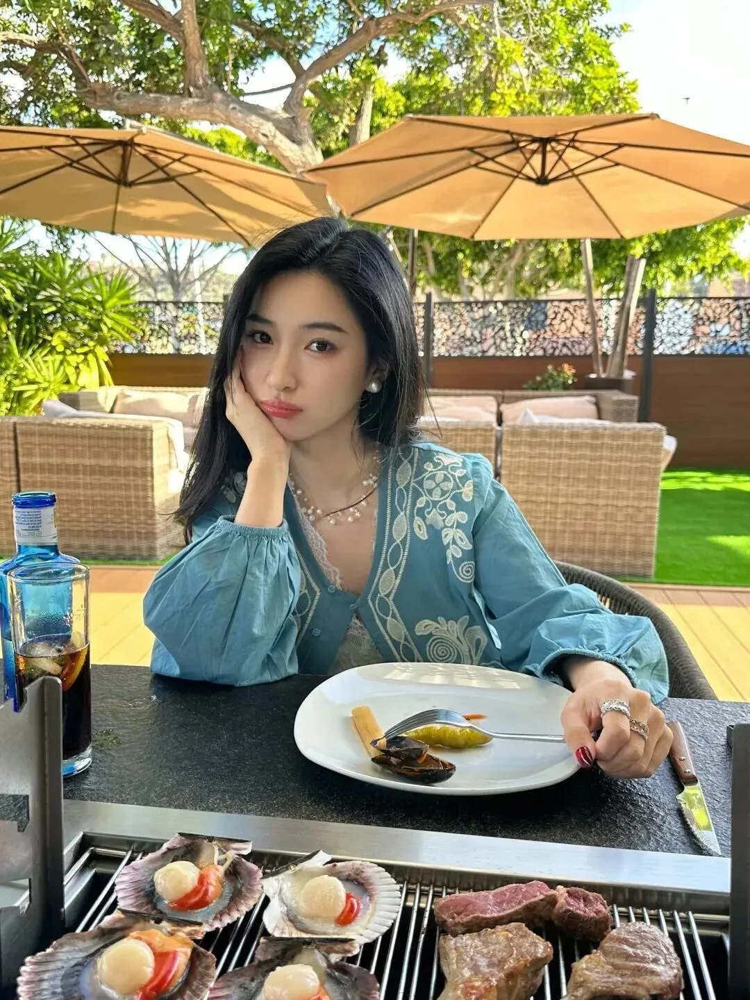 晚上吃饭时穿雾蓝色的上衣,棉麻质地柔软,白刺绣灯笼袖。她捧着脸吃饭,眼神懒洋洋的。桌上摆着烤肉和饮料,生活气息很浓厚。