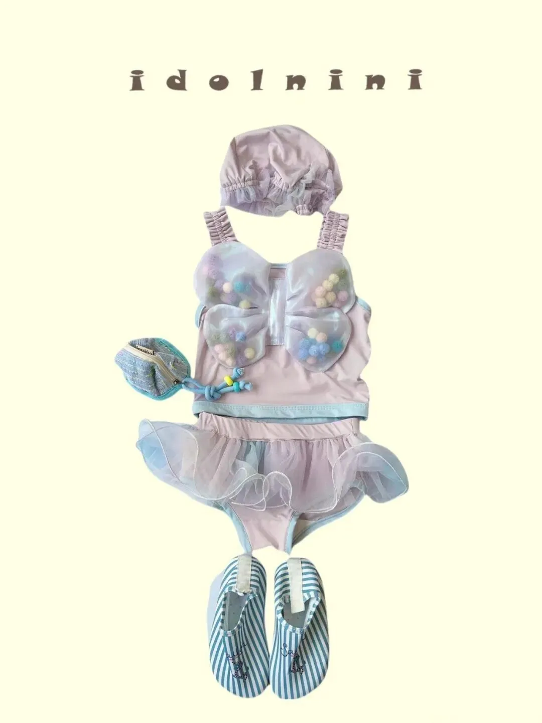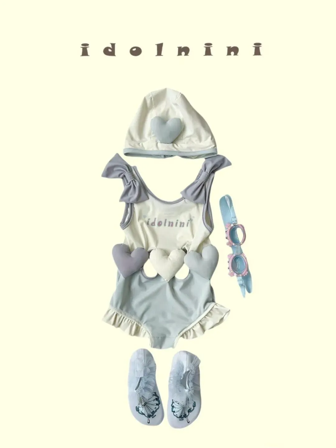 这一套是很稳的起手式,奶白和雾灰做主色,泳衣上有立体爱心,肩带还有蝴蝶结,帽子,泳镜,泳鞋也都配齐了,整体不是很跳,而是轻轻带一点甜,视觉会更干净,拍出来也更显整齐,