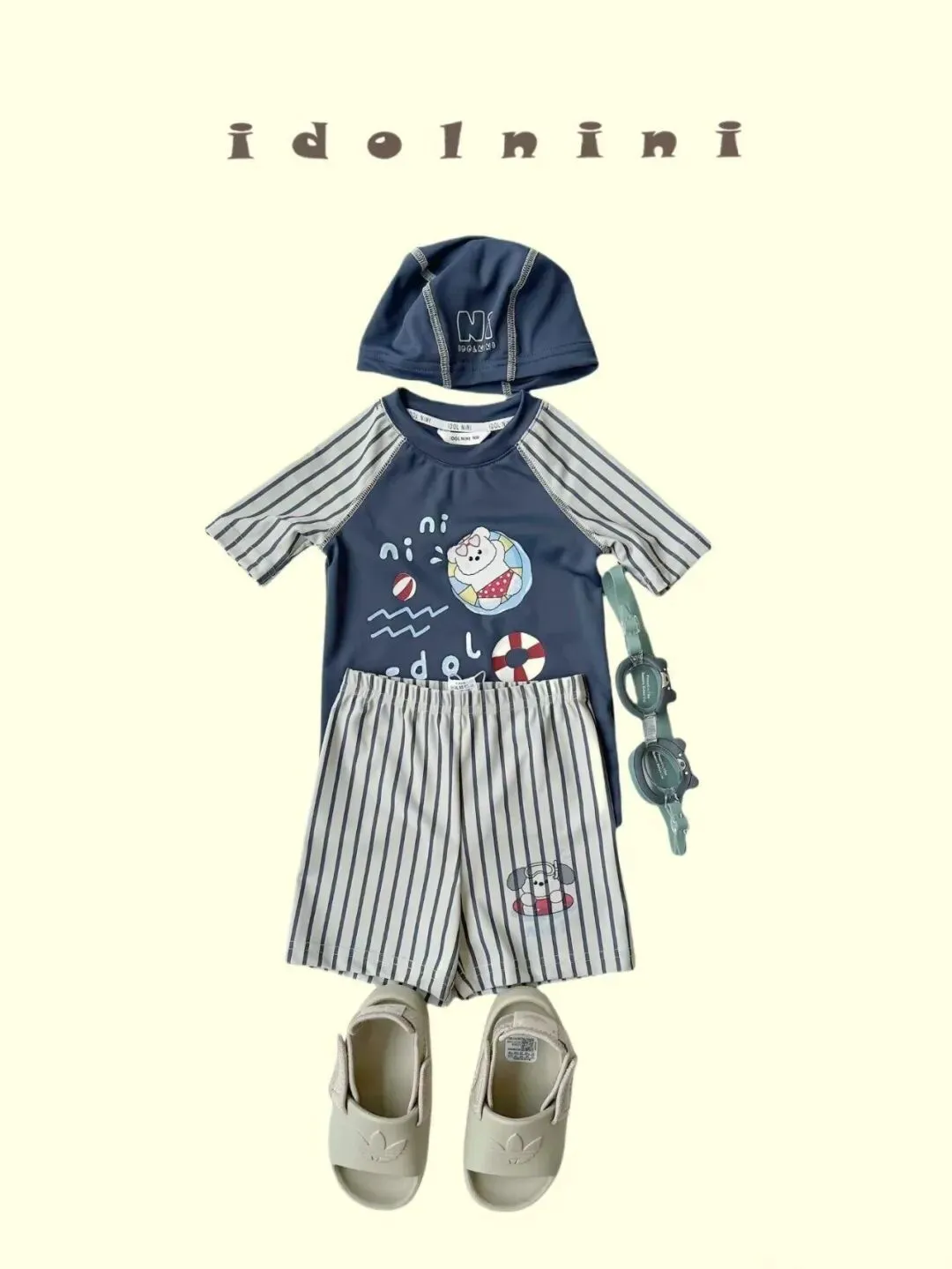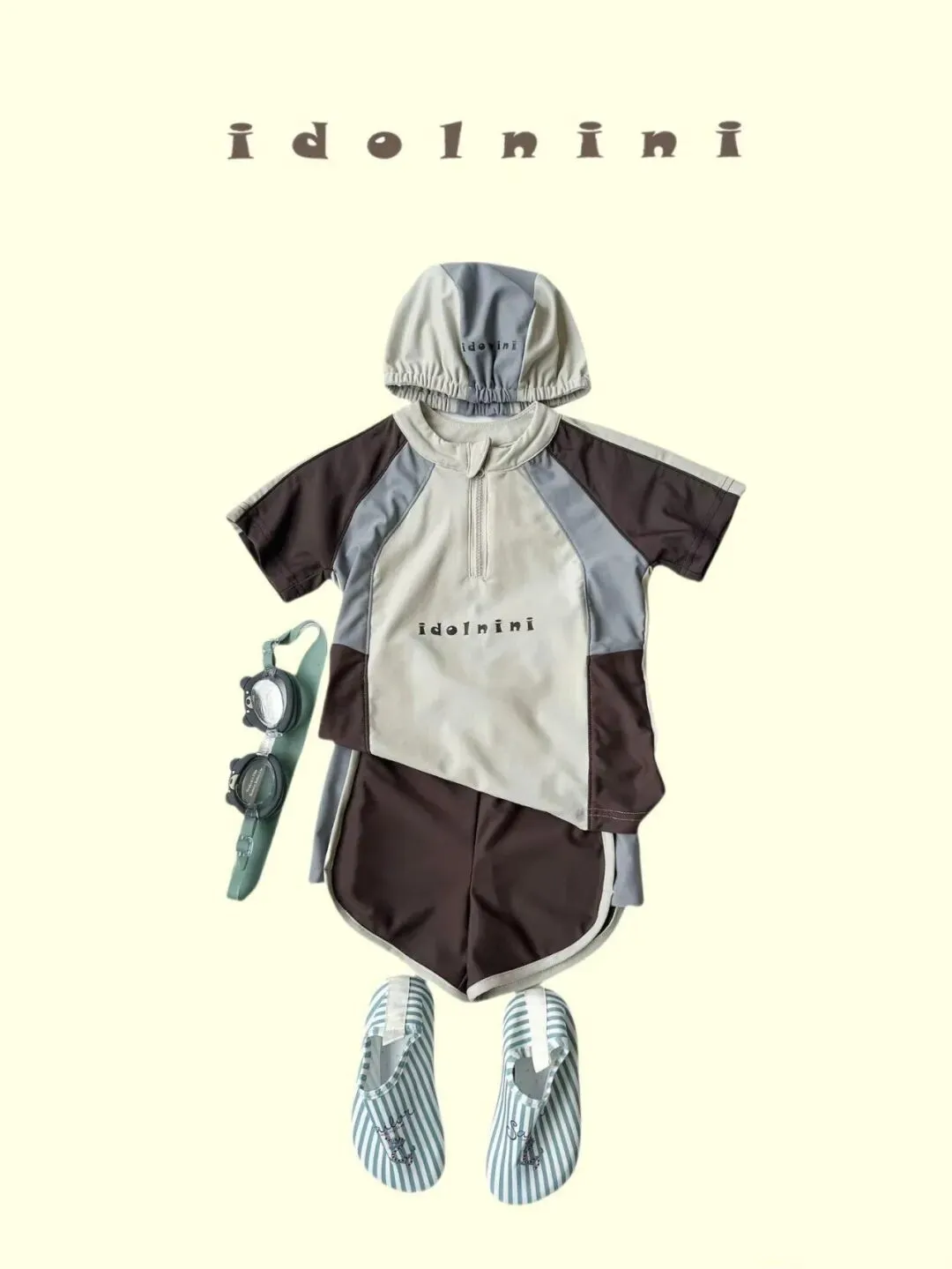 这一套就很适合偏实用型的家长看,短袖拉链上衣加短裤,帽子和泳镜配色也统一,整体是灰,奶白,深棕的拼色,虽然没有太多装饰,但轮廓很利落,照片里会显得特别干净,