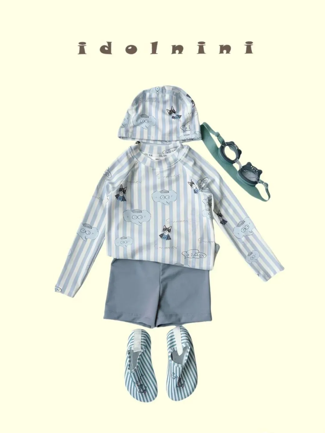 这一套是浅蓝白条纹长袖上衣,配雾蓝短裤,再搭同色泳镜和泳鞋,帽子上还有小图案,整体特别清爽,长袖款天然就有一点海边度假的感觉,看着很安静,但不会无聊,
