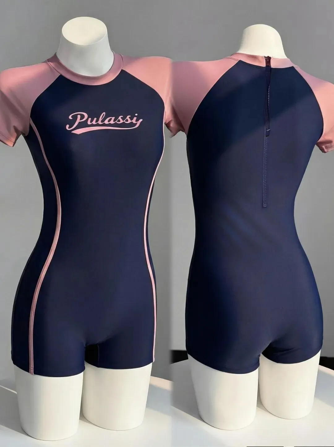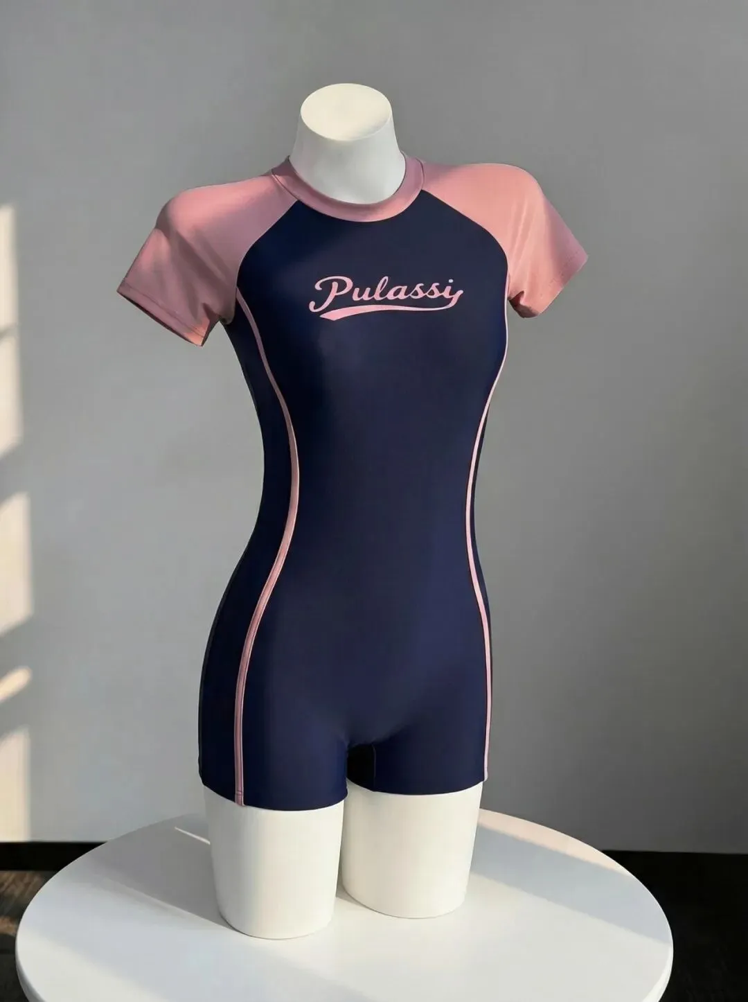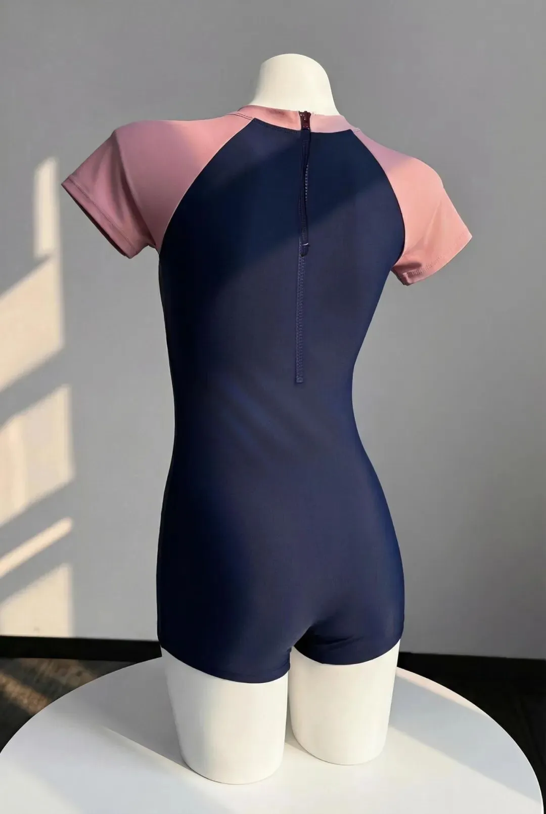 很多人拍泳衣照片,最怕的不是不够瘦,而是画面一杂,动作一多,整个人反而不利落,这组图的优势很明显,深蓝加浅粉的拼色连体泳衣,线条本身就很干净,在室内自然光下特别容易拍出高级感,