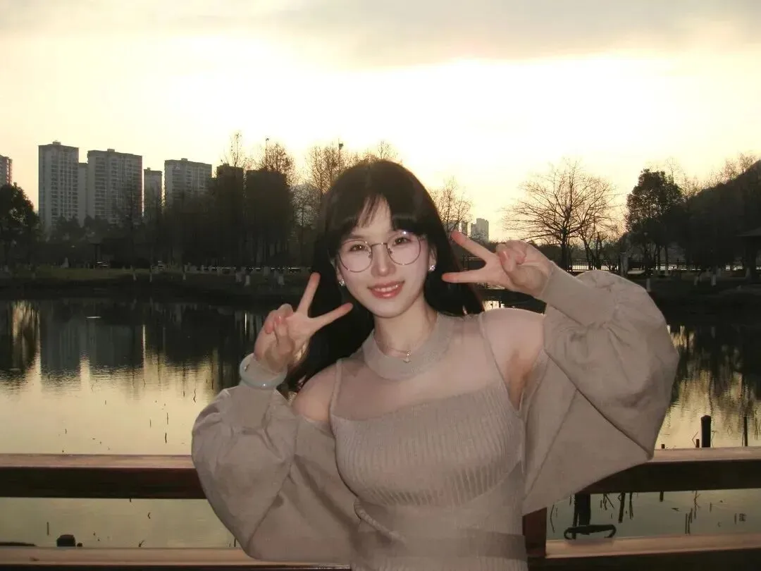 最后这套活泼多了,蝙蝠袖罩衫加上挂脖吊带,少女感扑面而来。她对着镜头比耶,笑得特别甜,就像夏天冒出的汽水一样。湖面上泛起黄昏的光,在这里它就显得浪漫到了偶像剧里。