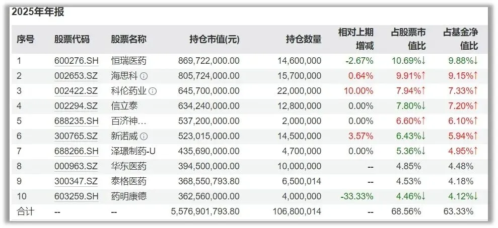 看看她都买了什么。根据2025年年报,前十大重仓股中,科伦药业、海思科、百济神州等创新药企占据了核心位置。前十大重仓股中有8家创新药企业。