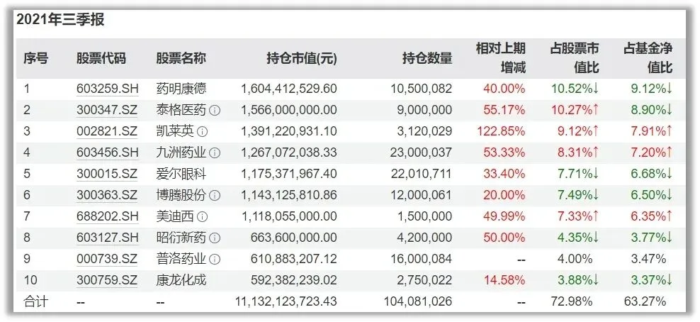 2021年三季度末,前十大重仓股包括了药明康德、凯莱英、博腾股份、泰格医药、九洲药业、美迪西等8家CXO企业。CXO的浓度依然很高。