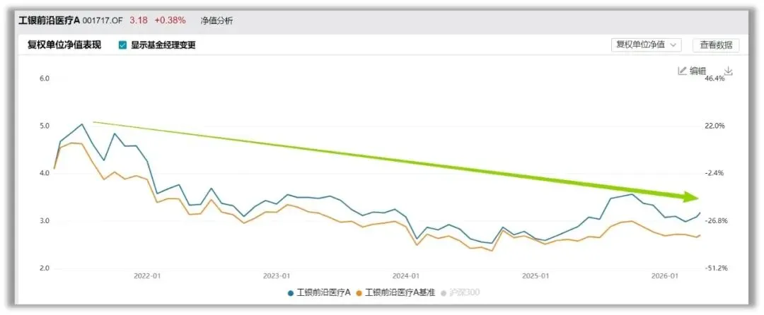 但后来的故事大家都知道了。2021年下半年开始,CXO板块深度回调。工银前沿医疗A的净值快速下降,基金的管理规模也从最高的176.25亿元一路下降,到2025年底仅剩下77.77亿元。