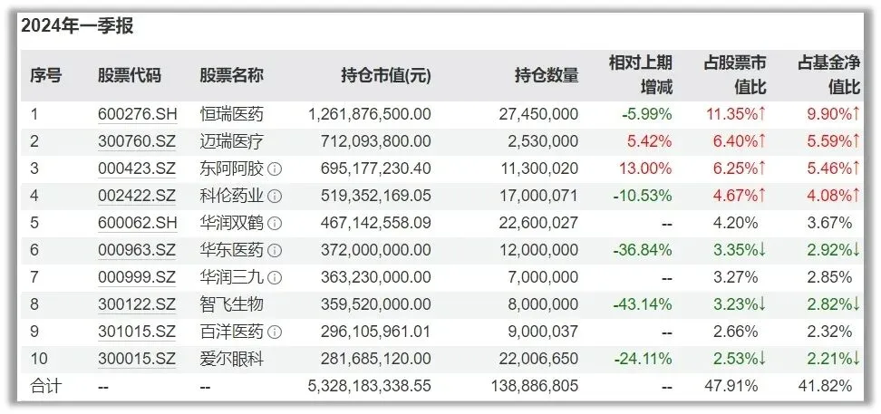而伴随着CXO的崩塌,赵蓓也开始了大幅砍仓。到2024年一季度,赵蓓管理的基金前十大重仓股占比41.82%——比起63.27%的峰值,已经收敛了不少。基金的持仓股更是大换血,医疗器械、中药、创新药、消费医疗、医药商业全面开花。高位时候的笃定和低位时候的悲观,天差地别