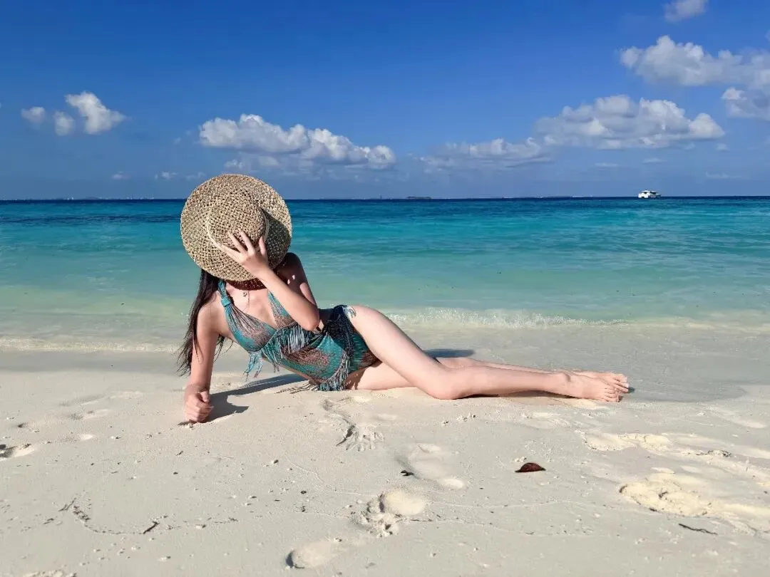 到了海边这张,动作反而收回来,身体侧躺在沙滩上,一只手肘撑住上半身,另一只手把草帽轻轻挡在脸前,腿自然向一侧伸出去,膝盖微微弯一点,不要绷直,头可以稍微低一点,让帽檐和海平线一起进入画面,